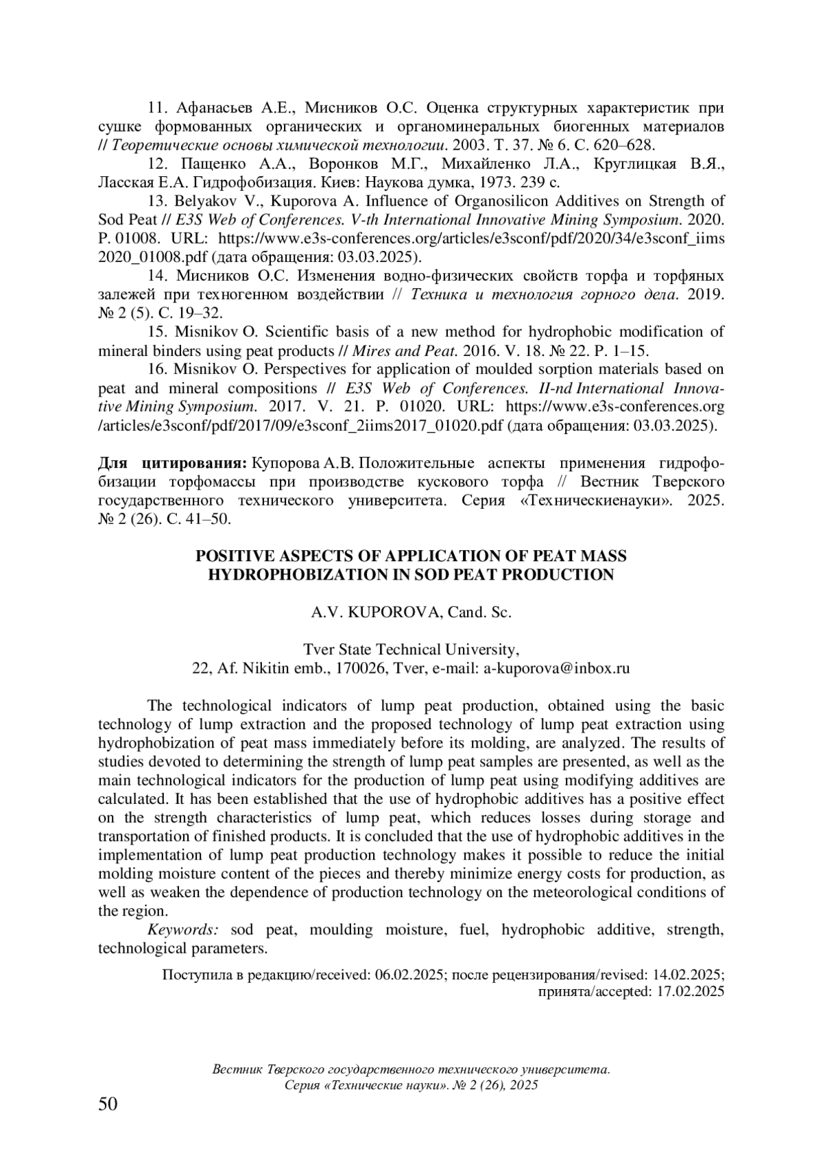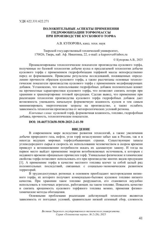 КУПОРОВА А. В. ПОЛОЖИТЕЛЬНЫЕ АСПЕКТЫ ПРИМЕНЕНИЯ ГИДРОФОБИЗАЦИИ ТОРФОМАССЫ ПРИ ПРОИЗВОДСТВЕ КУСКОВОГО ТОРФА // ВЕСТНИК ТВЕРСКОГО ГОСУДАРСТВЕННОГО ТЕХНИЧЕСКОГО УНИВЕРСИТЕТА. СЕРИЯ: ТЕХНИЧЕСКИЕ НАУКИ. 2025. № 2 (26)