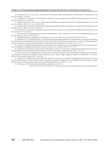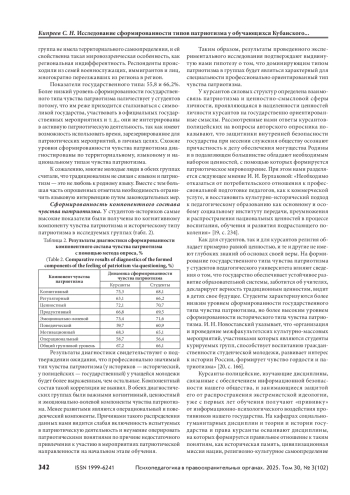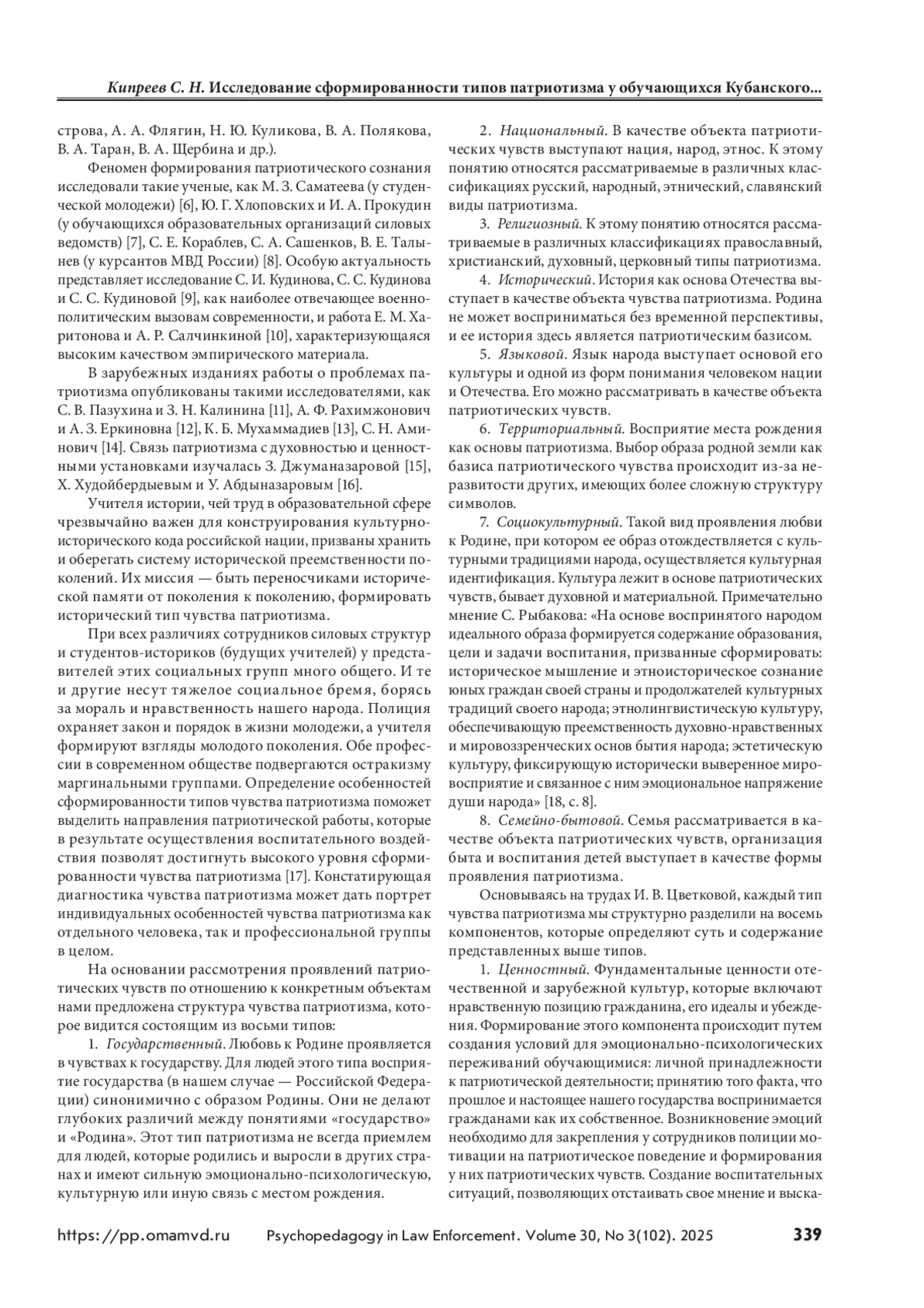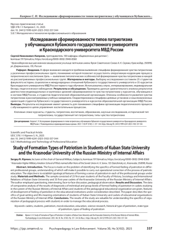 КИПРЕЕВ С. Н. ИССЛЕДОВАНИЕ СФОРМИРОВАННОСТИ ТИПОВ ПАТРИОТИЗМА У ОБУЧАЮЩИХСЯ КУБАНСКОГО ГОСУДАРСТВЕННОГО УНИВЕРСИТЕТА И КРАСНОДАРСКОГО УНИВЕРСИТЕТА МВД РОССИИ // ПСИХОПЕДАГОГИКА В ПРАВООХРАНИТЕЛЬНЫХ ОРГАНАХ. 2025. № 3 (102), ТОМ 30
