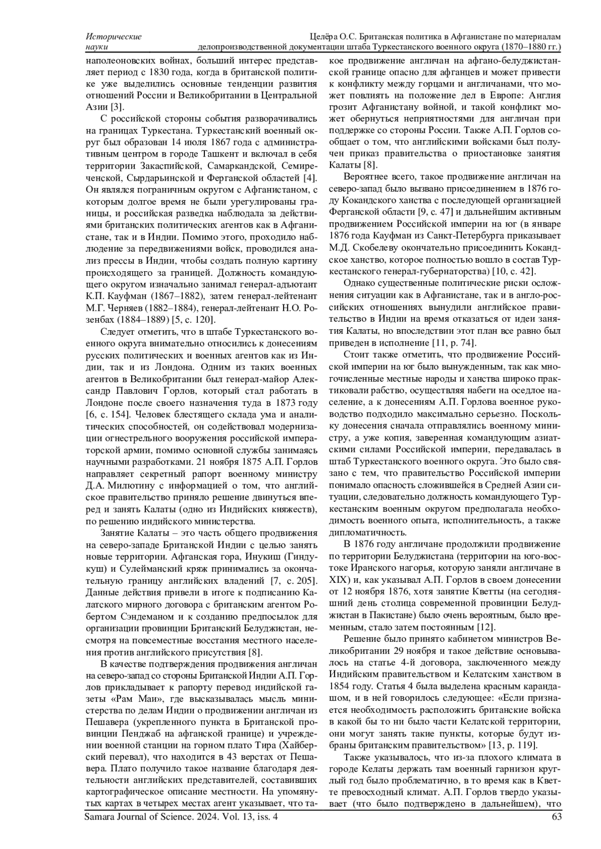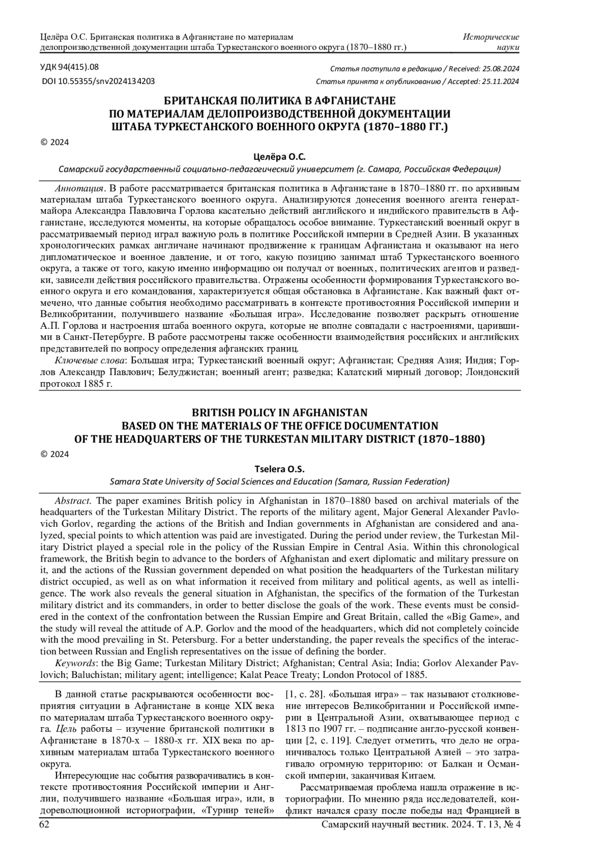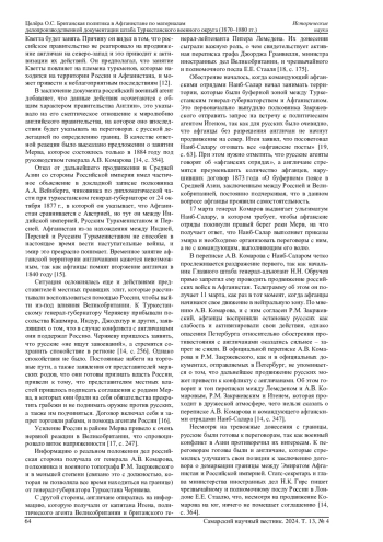 В работе рассматривается британская политика в Афганистане в 1870-1880 гг. по архивным материалам штаба Туркестанского военного округа. Анализируются донесения военного агента генерал-майора Александра Павловича Горлова касательно действий английского и индийского правительств в Афганистане, исследуются моменты, на которые обращалось особое внимание. Туркестанский военный округ в рассматриваемый период играл важную роль в политике Российской империи в Средней Азии. В указанных хронологических рамках англичане начинают продвижение к границам Афганистана и оказывают на него дипломатическое и военное давление, и от того, какую позицию занимал штаб Туркестанского военного округа, а также от того, какую именно информацию он получал от военных, политических агентов и разведки, зависели действия российского правительства. Отражены особенности формирования Туркестанского военного округа и его командования, характеризуется общая обстановка в Афганистане. Как важный факт отмечено, что данные события необходимо рассматривать в контексте противостояния Российской империи и Великобритании, получившего название «Большая игра». Исследование позволяет раскрыть отношение А. П. Горлова и настроения штаба военного округа, которые не вполне совпадали с настроениями, царившими в Санкт-Петербурге. В работе рассмотрены также особенности взаимодействия российских и английских представителей по вопросу определения афганских границ.
