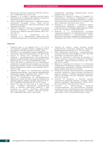 11. Беленова И. А., Подопригора А. В., Комарова Ю. Н. Формирование профессиональных компетенций ординаторов с использованием симуляционного оборудования. Прикладные информационные аспекты медицины. 2022; 25(1): 23-26.