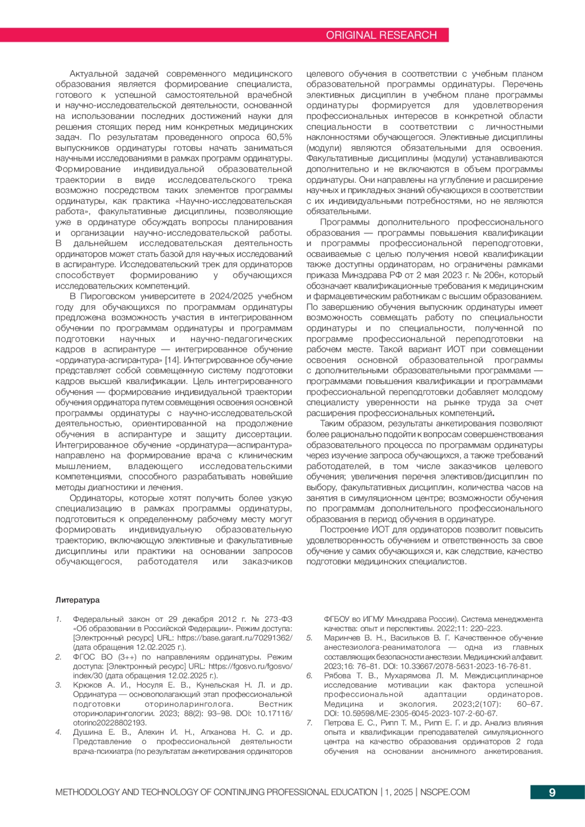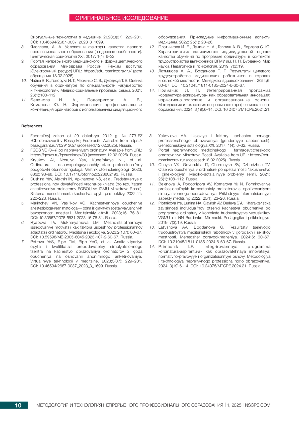 3. Крюков А. И., Носуля Е. В., Кунельская Н. Л. и др. Ординатура - основополагающий этап профессиональной подготовки оториноларинголога. Вестник оториноларингологии. 2023; 88(2): 93-98. DOI: 10.17116/otorino20228802193