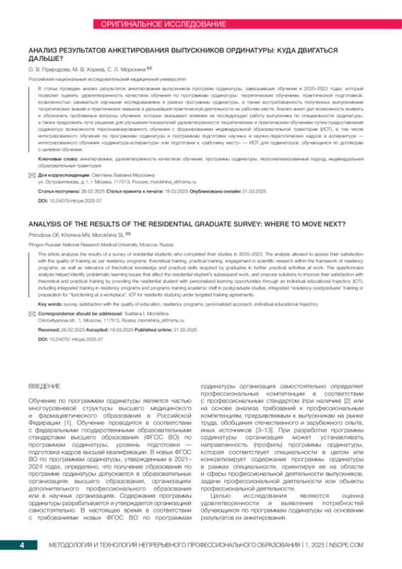 В статье проведен анализ результатов анкетирования выпускников программ ординатуры, завершивших обучение в 2020–2023 годах, который позволил оценить удовлетворенность качеством обучения по программам ординатуры: теоретическим обучением, практической подготовкой, возможностью заниматься научными исследованиями в рамках программы ординатуры, а также востребованность полученных выпускниками теоретических знаний и практических навыков в дальнейшей практической деятельности на рабочем месте. Анализ анкет дал возможность выявить и обозначить проблемные вопросы обучения, которые оказывают влияние на последующую работу выпускника по специальности ординатуры, а также предложить пути решения для улучшения показателей удовлетворенности теоретическим и практическим обучением путем предоставления ординатору возможности персонализированного обучения с формированием индивидуальной образовательной траектории (ИОТ), в том числе интегрированного обучения по программам ординатуры и программам подготовки научных и научно-педагогических кадров в аспирантуре — интегрированного обучения «ординатура-аспирантура» или подготовки к «рабочему месту» — ИОТ для ординаторов, обучающихся по договорам о целевом обучении.