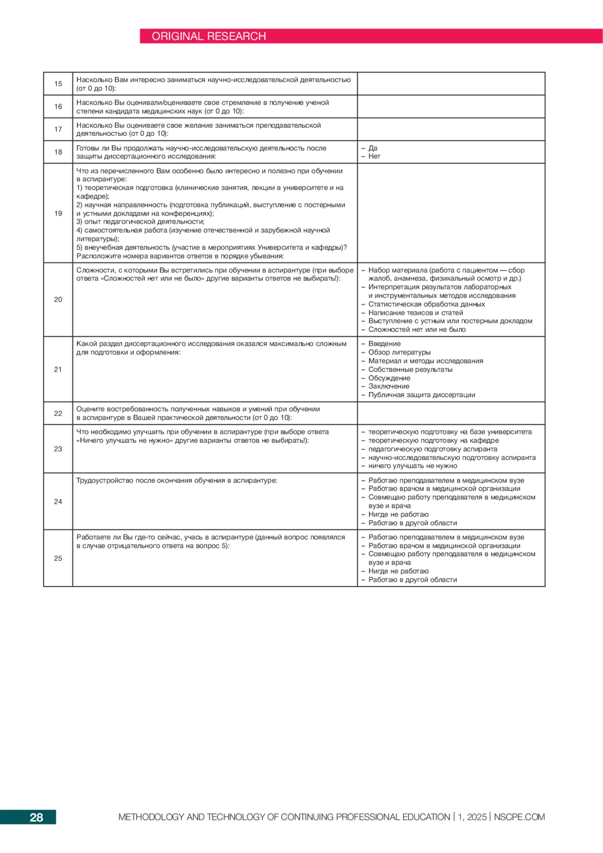 В статье проанализирована результативность обучения в аспирантуре на кафедре терапевтического профиля медицинского университета. Проведен анонимный опрос 11 аспирантов (6 мужчин и 5 женщин) в возрасте от 26 до 35 лет, обучавшихся по специальности «внутренние болезни» и «кардиология» в период с 2018 по 2024 г. Все аспиранты, которые закончили обучение в аспирантуре, успешно и в срок сдали государственную итоговую аттестацию, защитили научно-квалификационную работу и диссертацию. Ответ на вопрос «Насколько Вам интересно заниматься научно-исследовательской деятельностью?» соответствовал 10 (9; 10), «Насколько Вы оцениваете свое желание заниматься преподавательской деятельностью?» — 10 (9; 10) баллам. За желание продолжить заниматься научно-исследовательской деятельностью после защиты диссертации проголосовали все аспиранты. Сложности с набором материала отметили 55%, со статистической обработкой данных — 36%, с подготовкой раздела «обзор литературы» — 27%, «материал и методы исследования» — 18%, «собственные результаты» — 18% аспирантов. На вопрос, что необходимо улучшить при обучении в аспирантуре, 63,64% аспирантов ответили, что ничего улучшать не следует, 36,36% выбрали научно-исследовательскую подготовку, 9,09% — теоретическую подготовку на базе университета. Специфика обучения в аспирантуре на кафедре поликлинической терапии Института клинической медицины с использованием многосторонней подготовки специалистов в теоретическом, научном и педагогическом направлении способствует эффективной подготовке диссертационного исследования и ее защите в срок. Прослеживается высокая заинтересованность аспирантов в научной и педагогической деятельности.