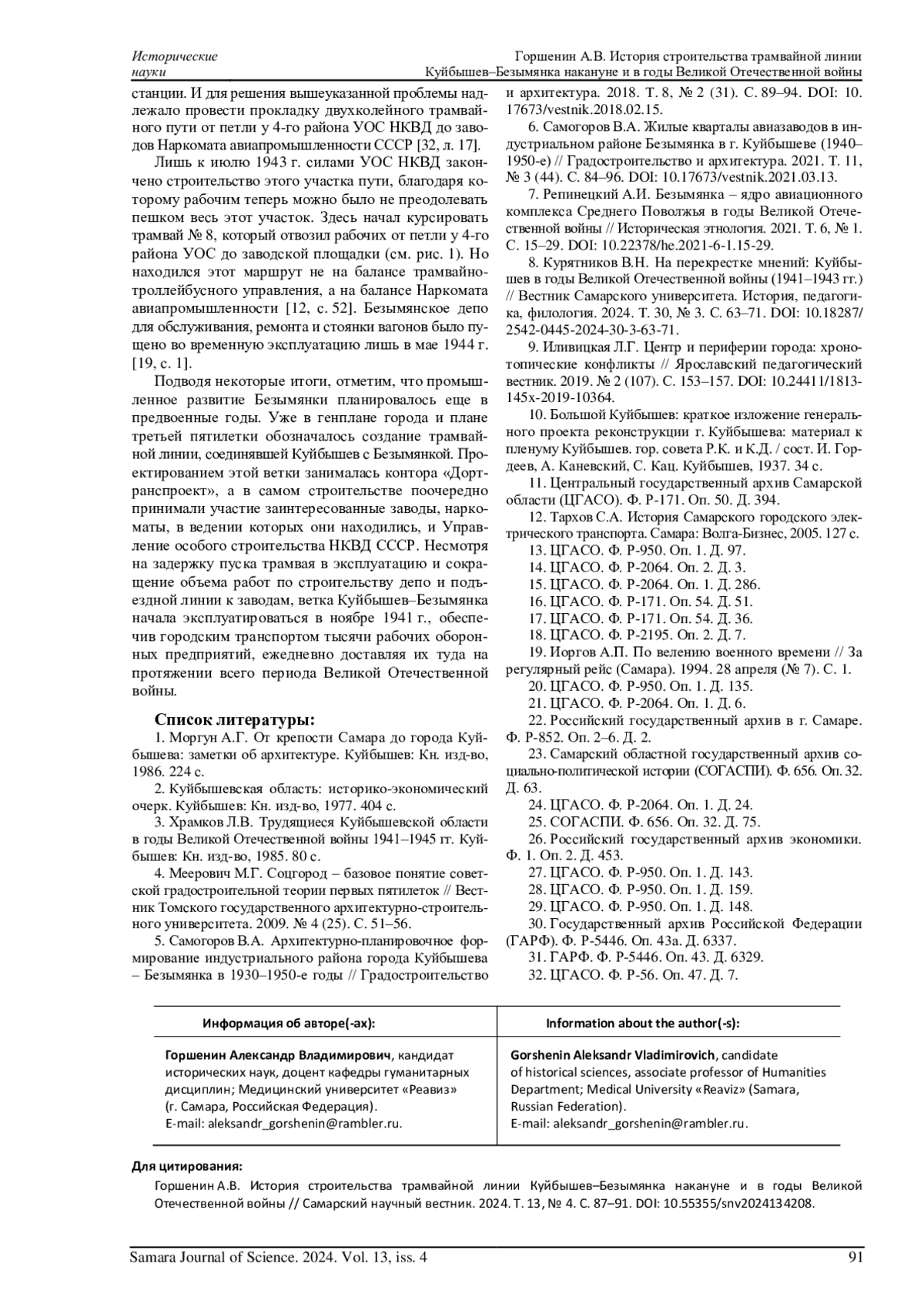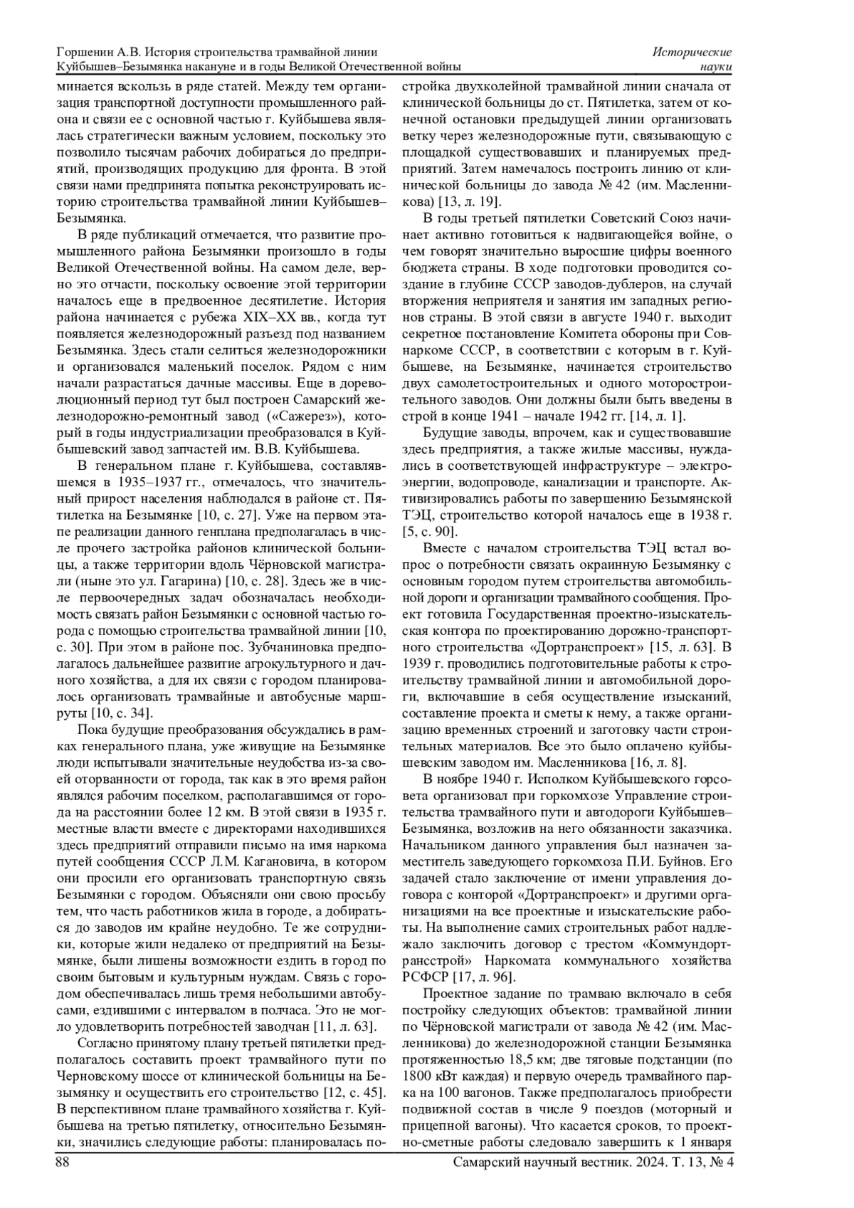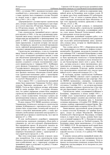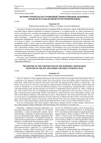 ГОРШЕНИН А. В. ИСТОРИЯ СТРОИТЕЛЬСТВА ТРАМВАЙНОЙ ЛИНИИ КУЙБЫШЕВ-БЕЗЫМЯНКА НАКАНУНЕ И В ГОДЫ ВЕЛИКОЙ ОТЕЧЕСТВЕННОЙ ВОЙНЫ // САМАРСКИЙ НАУЧНЫЙ ВЕСТНИК. 2024. ТОМ 13, № 4