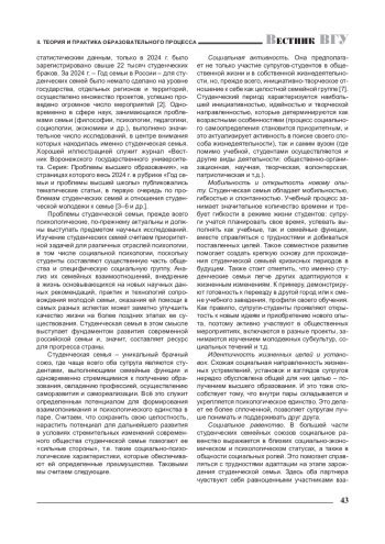 В статье анализируется актуальность социально-психологического исследования студенческих семей в современном российском обществе, поскольку они служат важным социальным ресурсом развития института семьи в России. Охарактеризованы такие «сильные стороны» студенческой семьи, позволяющие ей преодолевать вызовы современности, как: социальная активность, мобильность и открытость новому опыту, идентичность жизненных целей и установок молодых супругов, социальный оптимизм, социальное равенство, антиципационные способности как «взгляд в будущее». Вместе с тем обращается внимание на то, что студенческая семья сталкивается с социетальными (имеющими внешние источники и причины) и локальными (имеющими внутрисемейную природу) проблемами, что требует от нее определенного уровня социально-психологической зрелости, позволяющей находить конструктивные способы их преодоления.