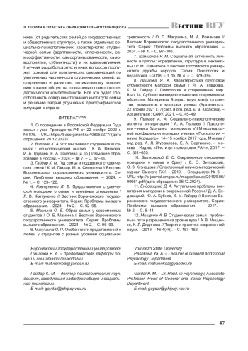 4. Ковтуненко Л. В. Представления студенческой молодежи о семье и семейных отношениях / Л. В. Ковтуненко // Вестник Воронежского государственного университета. Серия: Проблемы высшего образования. - 2024. - № 2. - С. 92-95. EDN: AVPUXX