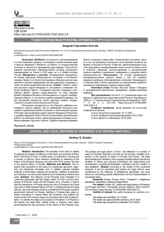 Анализ. Говоря о влиянии прусского короля Фридриха II, как правило, упоминают военную реформу Павла I и введение прусских порядков в российскую армию. Однако, представляется, что опыт Пруссии времен Фридриха Великого использовался и в других преобразованиях Павла I, в том числе в судебно-правовой реформе, так как российский император считал прусскую модель государственного устройства актуальной для России. Построение государства по типу Пруссии требовало инноваций в разных сферах; при их проведении большую роль сыграли мировоззренческие установки и политический дискурс XVIII века. Для выявления идей и практик Фридриха II Прусского в судебно-правовой области были использованы оригинальные работы на немецком языке, демонстрирующие ключевые положения реформы прусского короля. Судебно-правовая реформа Павла I отражена в ряде работ отечественных историков, однако в них не проводится детальное сопоставление аспектов реформы в Пруссии и России. К фактам, демонстрирующих сходство проводимых преобразований, можно отнести отмену пыток и телесных наказаний, реструктуризацию и централизацию органов судебного управления, унификацию и создание нового законодательства.