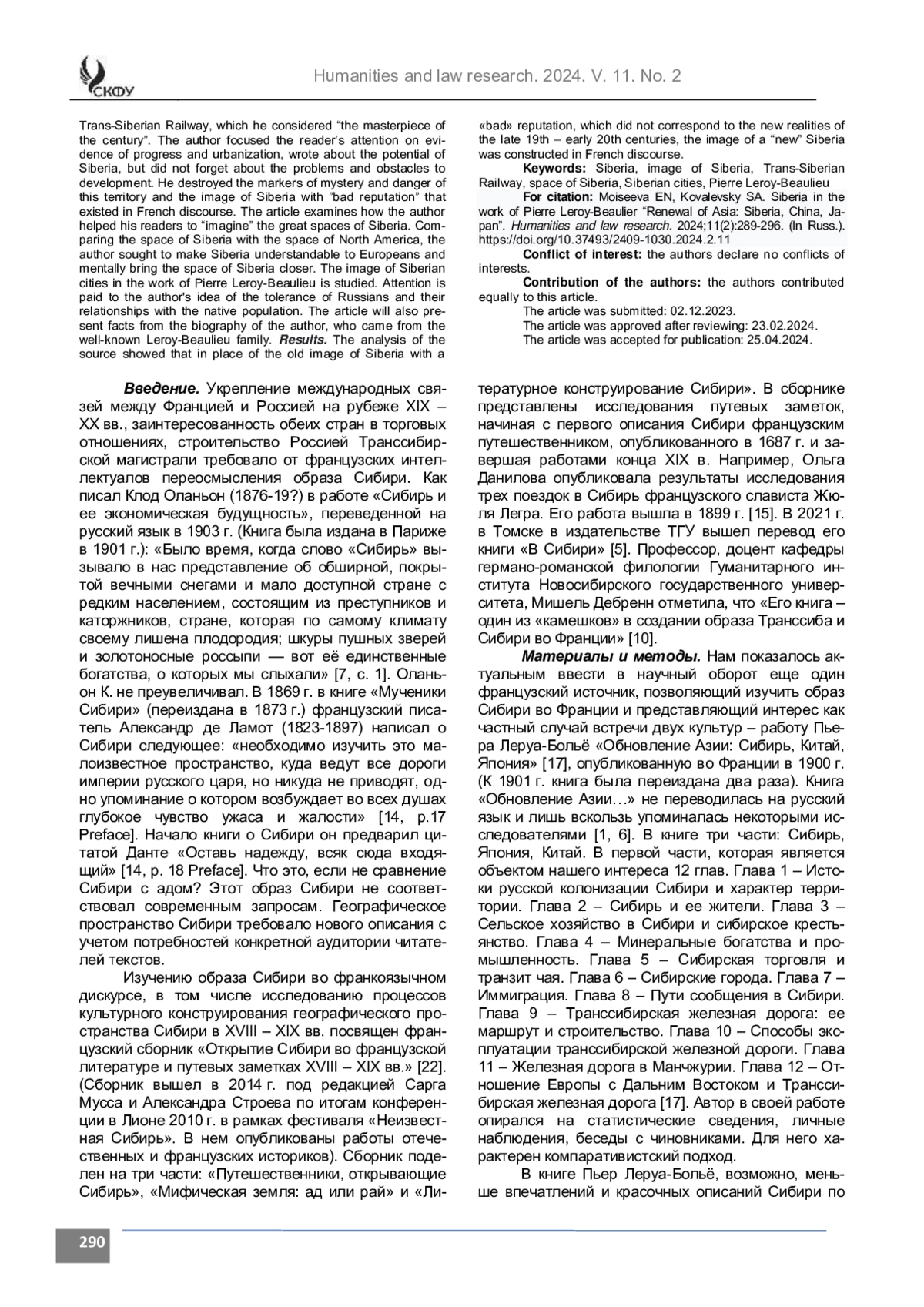 Материалы и методы. Источник «Обновление Азии: Сибирь, Китай, Япония» не переводился на русский язык и впервые вводится в научный оборот. В нем представлен позитивный образ России. Работа Пьера Леруа-Больё – это серьезный труд, основанный на статистических данных, научных исследованиях и личных наблюдениях автора, сделанных в ходе путешествия по Сибири. В работе использованы методологические принципы междисциплинарного научного направления имагологии, а также исследовательские подходы пространственной имперской истории, которая предполагает не только изучение практик освоения пространства, но и его репрезентации.