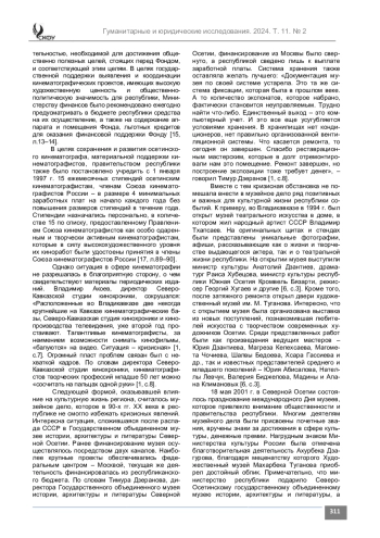 19. Цориева И. Т. Кинематограф народов Северного Кавказа в 1960-е -1980-е гг.: историко-политические аспекты развития // Известия СОИГСИ. № 24 (63). 2017. С. 59-69.