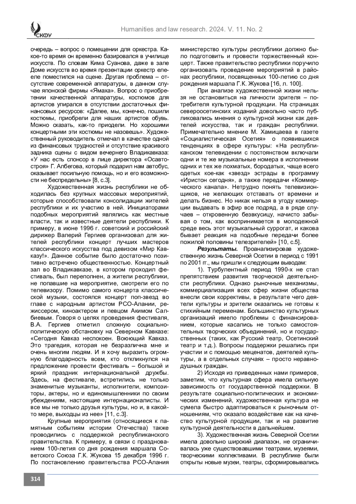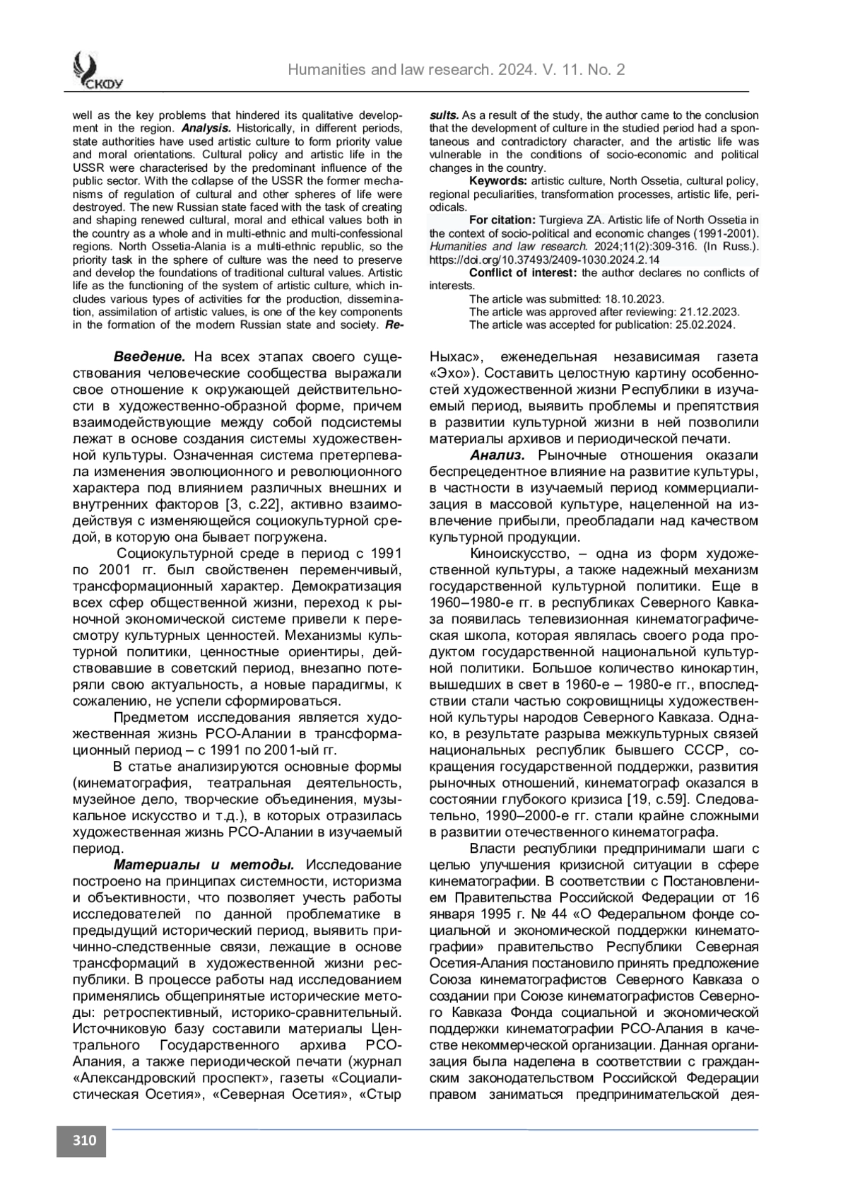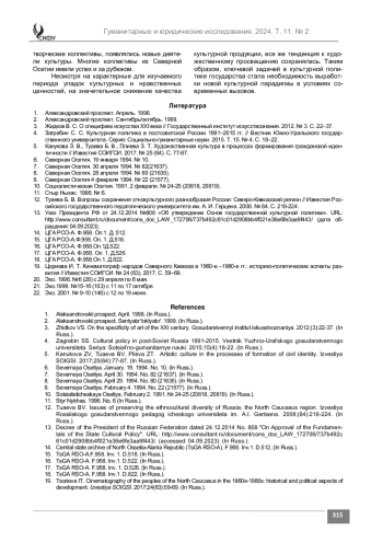 общественной жизни в России, что во многом определило и вектор дальнейшего развития художественной культуры. Именно художественная культура является той областью, которая отражает и переосмысливает трансформационные и кризисные явления в любом государстве. Актуальность исследования обуславливается признанием государственной культурной политики в качестве неотъемлемой части стратегии национальной безопасности Российской Федерации. Несомненно, художественная жизнь требует тщательного изучения с целью анализа государственной культурной политики и реализации исторической действительности в этнокультурной составляющей. Новизна исследования в том, что впервые проблема, выявляющая региональные особенности художественной культуры, освещается с привлечением массива архивных документов и материалов периодической печати Северной Осетии. Обращение к относительно прошлому периоду позволяет определить и сформулировать ключевые проблемы, а также задачи, имеющие релевантность в современном обществе для своевременного решения.