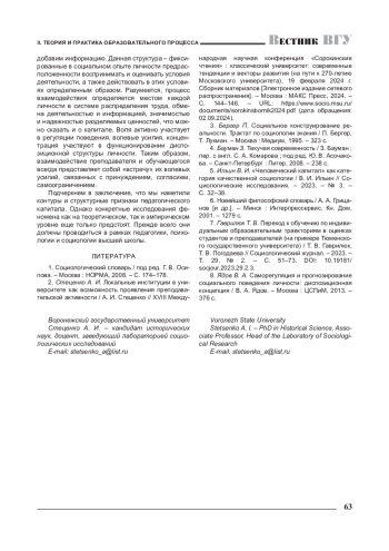 2. Стеценко А. И. Локальные институции в университете как возможность проявления преподавательской активности / А. И. Стеценко //XVIII Международная научная конференция “Сорокинские чтения”: классический университет: современные тенденции и векторы развития (на пути к 270-летию Московского университета), 19 февраля 2024 г. Сборник материалов [Электронное издание сетевого распространения]. - Москва: МАКС Пресс, 2024. -С. 144-146. - URL: https://www.socio.msu.ru/documents/sorokinsbornik2024.pdf (дата обращения: 02.09.2024).