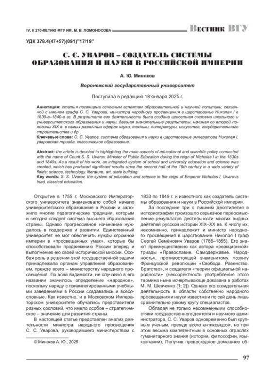 Статья посвящена основным аспектам образовательной и научной политики, связанной с именем графа С. С. Уварова, министра народного просвещения в царствование Николая I в 1830-е-1840-е гг. В результате его деятельности была создана целостная система школьного и университетского образования и науки, давшая значительные результаты, начиная со второй половины XIX в. в самых различных сферах науки, техники, литературы, искусства, государственного строительства и др.