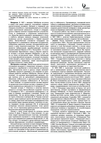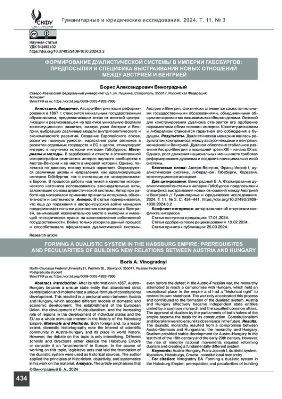 Материалы и методы. В зарубежной и отчасти в отечественной историографии отмечается интерес научного сообщества к Австро-Венгрии и ее месту в мировой истории. Однако, полемика по данному поводу только нарастает. Формируются различные школы и направления, как идеализирующие империю Габсбургов, так и считающие ее «анахронизмом» в Европе. В процессе работы над темой в качестве исторического источника использовались законодательные акты, заложившие основы дуалистической системы. Автор при работе над материалом применял принципы историзма, объективности и системности.