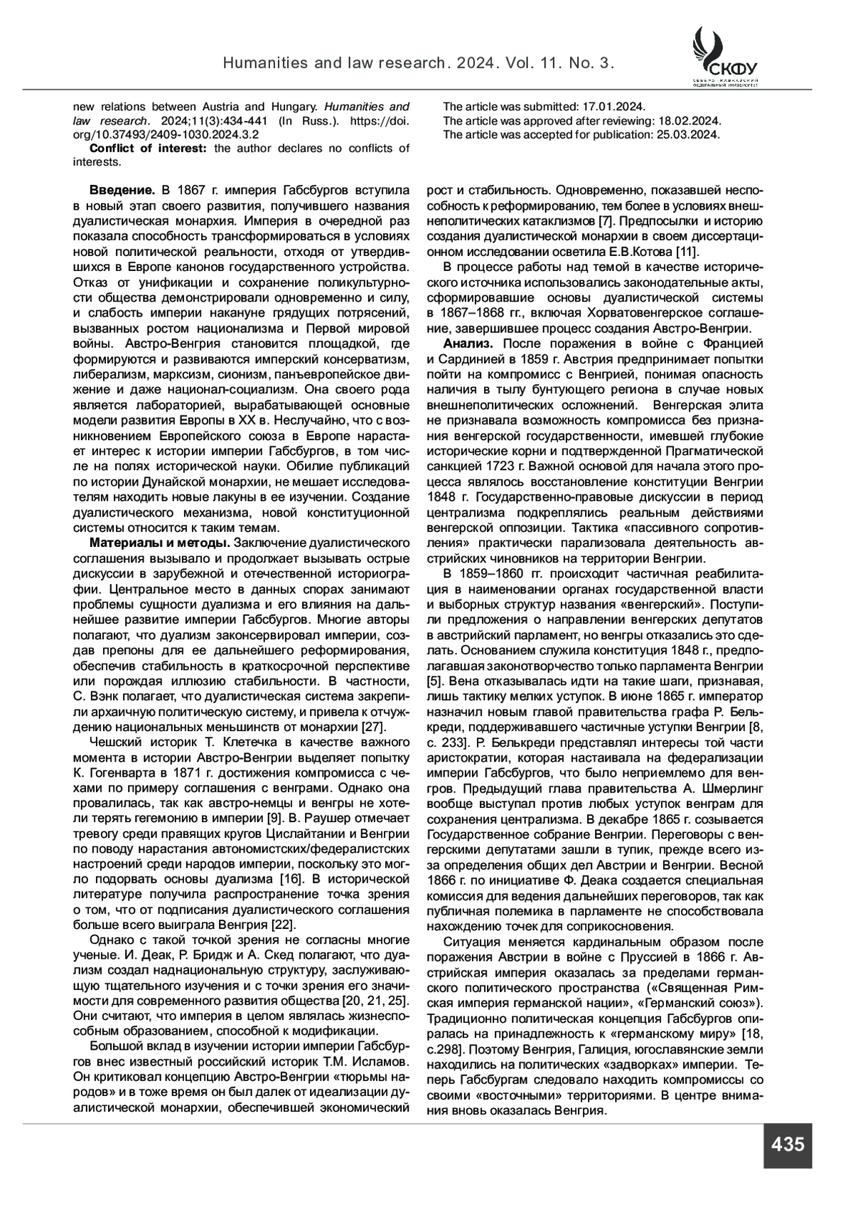 Анализ. В статье подчеркивается, что еще до поражения в австро-прусской войне монархия предпринимает попытки достижения компромисса с Венгрией, занимавшей исключительное место в империи и имеющей «историческое право» на восстановление собственной государственности. Война только ускорила данный процесс и способствовала оформлению дуалистической системы. Австрия и Венгрия, фактически становятся самостоятельными государственными образованиями, объединенными общим монархом и так называемыми общими делами. Основой для конструирования дуализма становится его одобрение парламентами обеих половин империи. Конституционализм и либерализм становится гарантией его соблюдения в будущем.