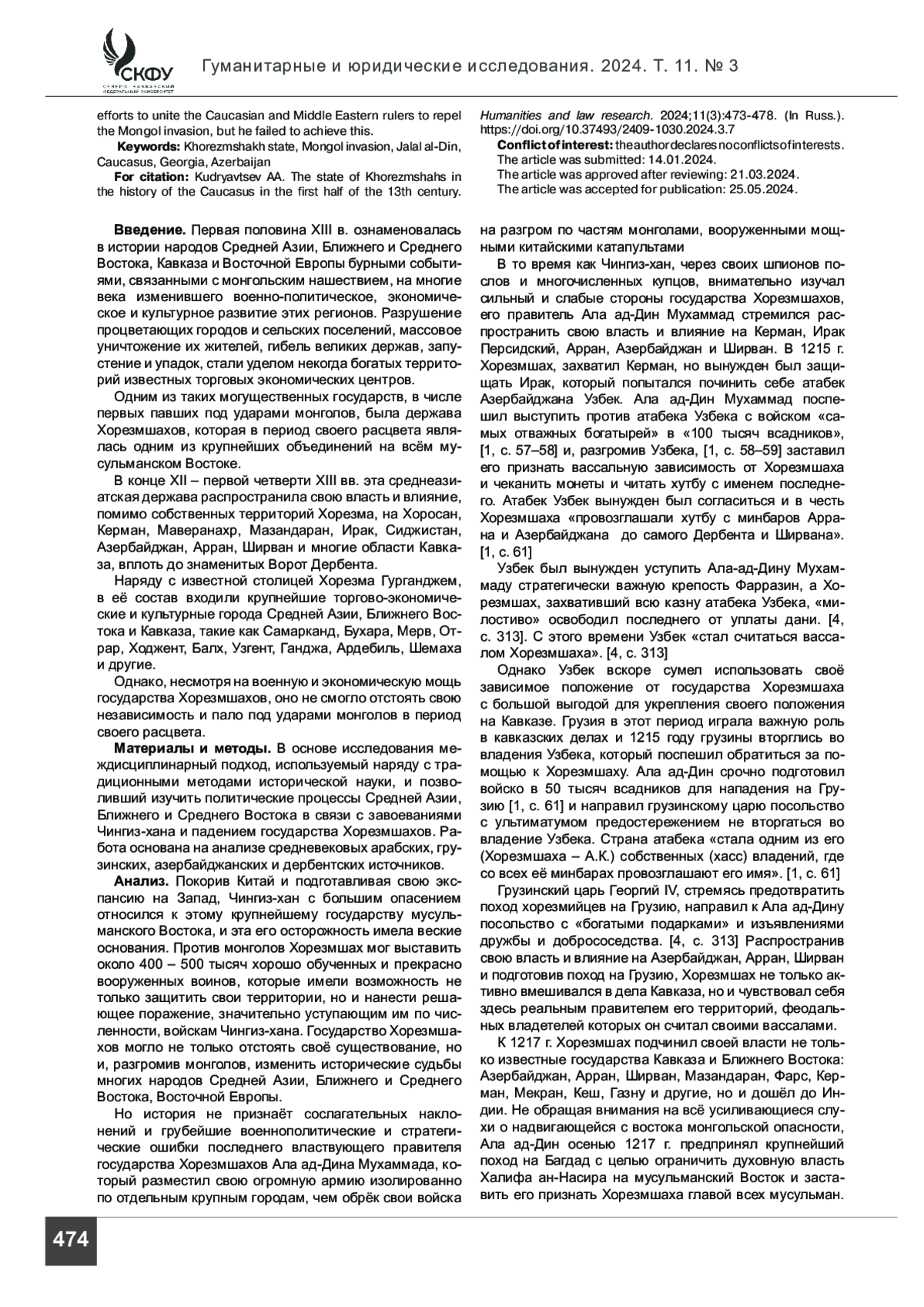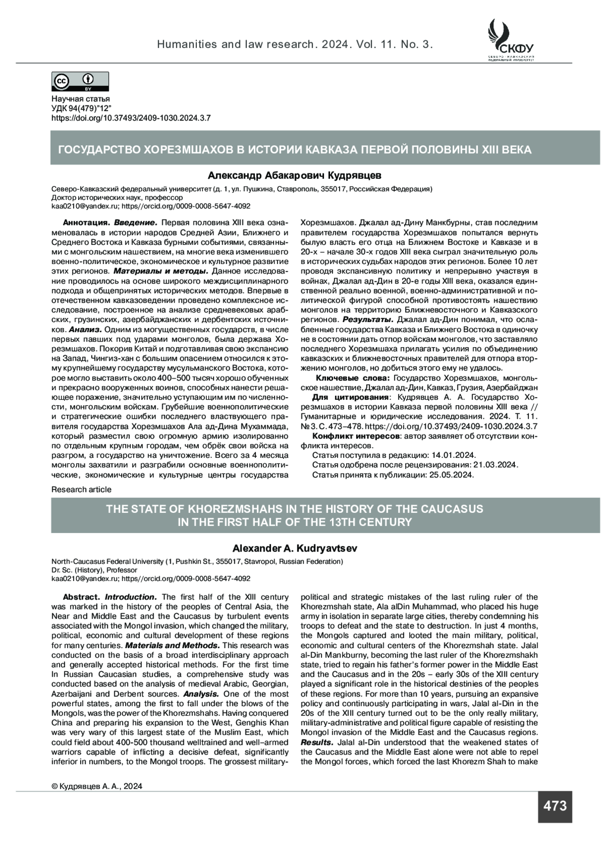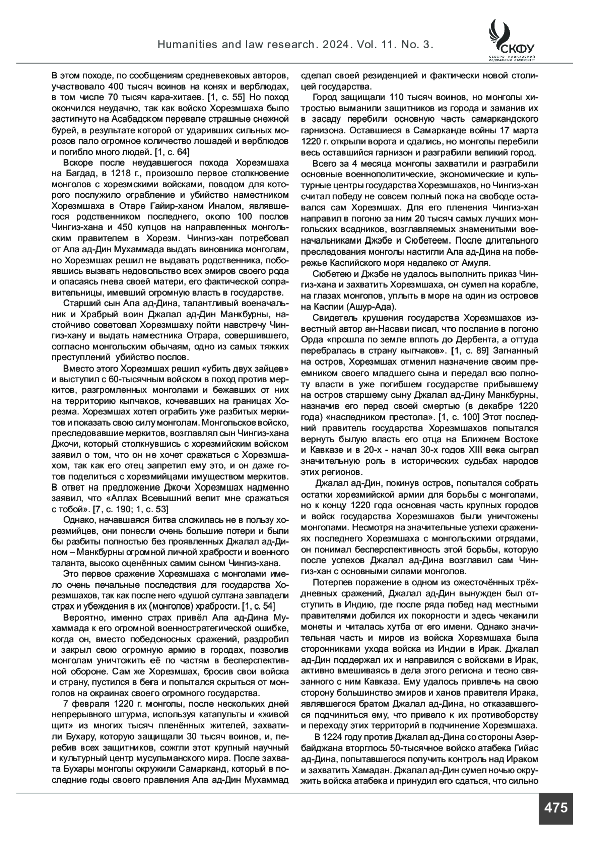 Анализ. Одним из могущественных государств, в числе первых павших под ударами монголов, была держава Хорезмшахов. Покорив Китай и подготавливая свою экспансию на Запад, Чингиз-хан с большим опасением относился к этому крупнейшему государству мусульманского Востока, которое могло выставить около 400–500 тысяч хорошо обученных и прекрасно вооруженных воинов, способных нанести решающее поражение, значительно уступающим им по численности, монгольским войскам. Грубейшие военно-политические и стратегические ошибки последнего властвующего правителя государства Хорезмшахов Ала ад-Дина Мухаммада, который разместил свою огромную армию изолированно по отдельным крупным городам, чем обрёк свои войска на разгром, а государство на уничтожение. Всего за 4 месяца монголы захватили и разграбили основные военно-политические, экономические и культурные центры государства Хорезмшахов. Джалал ад-Дину Манкбурны, став последним правителем государства Хорезмшахов попытался вернуть былую власть его отца на Ближнем Востоке и Кавказе и в 20-х – начале 30-х годов XIII века сыграл значительную роль в исторических судьбах народов этих регионов. Более 10 лет проводя экспансивную политику и непрерывно участвуя в войнах, Джалал ад-Дин в 20-е годы XIII века, оказался единственной реально военной, военно-административной и политической фигурой способной противостоять нашествию монголов на территорию Ближневосточного и Кавказского регионов.