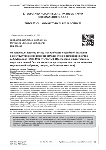 Shurukhnova D.N., Shurukhnov N.G. From the concept of the draft Police Charter of the Russian Empire to its structure and content: views of members of the Commission Senator A.A. Makarov and their significance for the formation of legal acts and improvement of the police of the Russian Federation. Part 1. The essence of police duties, the main goal and limits of the activities of the police of the Russian Empire according to the draft Police Charter // Gaps in Russian legislation. - 2023. - T. 16. - No. 6. - P. 13-20. EDN: WLSSUU