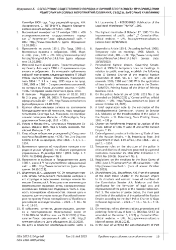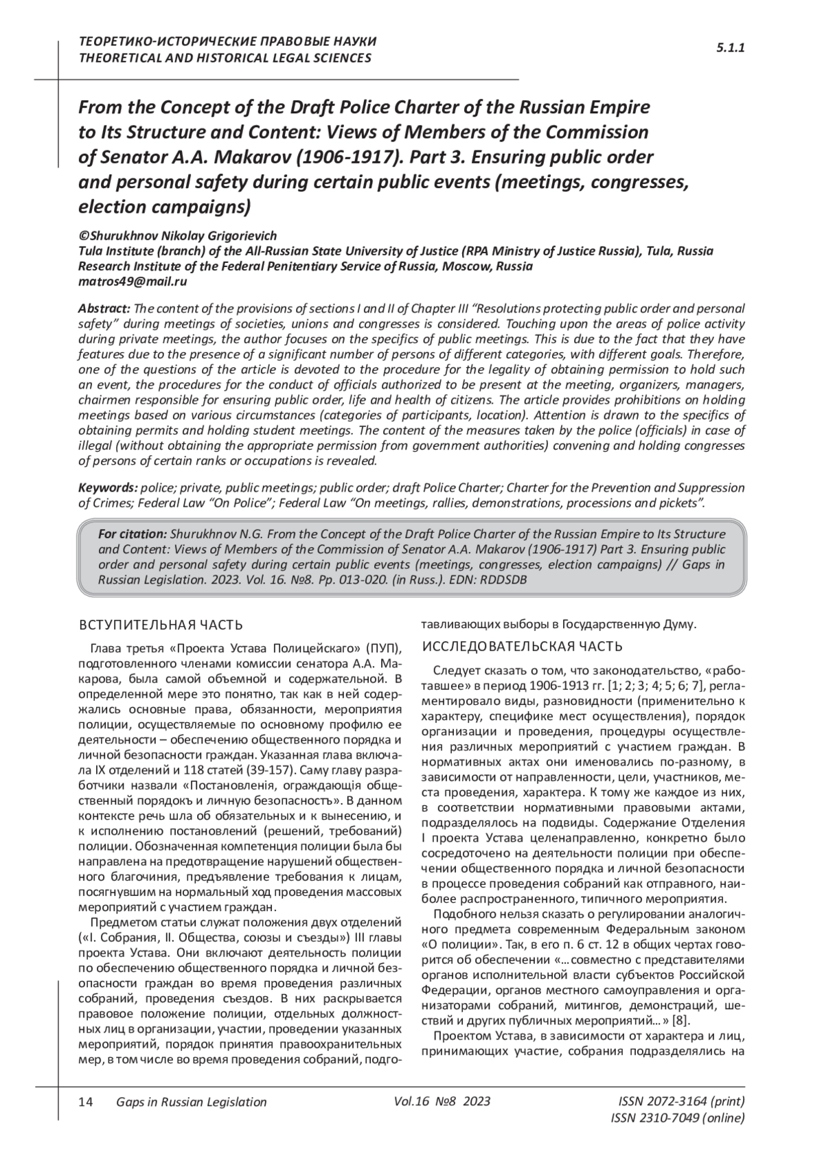14. Шурухнова Д.Н., Шурухнов Н.Г. От концепции проекта Устава полицейского Российской империи к его структуре и содержанию: взгляды членов Комиссии Сенатора А.А. Макарова и их значение для формирования правовых актов, совершенствования полиции Российской Федерации. Часть 1. Сущность полицейских обязанностей, главная цель и пределы деятельности полиции Российской империи по проекту Устава полицейского // Пробелы в российском законодательстве. - 2023. - Т. 16.- № 6. - С. 13-20. EDN: WLSSUU