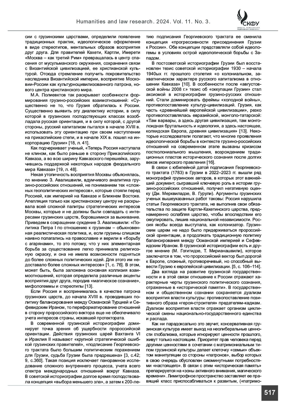 Введение. Современная история грузино-российских отношений отмечена рецидивами «холодной войны». Прошла разделительная линия между народами, обладающих многовековой историей взаимоотношений. В статье анализируется комплекс причин, вызывающих взаимное недопонимание между государствами и народами, внесших значительный вклад в развитие мировой цивилизации. Отмечено, что на современный процесс грузино-российских отношений значительное влияние оказывает «наследие прошлого», его интерпретация представителями интеллектульного сообщества, правящих элит. Показано, что, помимо этого, значительное влияние на грузино-российский диалог оказывает и «глубинная культура», сохраняющая цивилизационно-культурные пласты вековых взаимодействий.