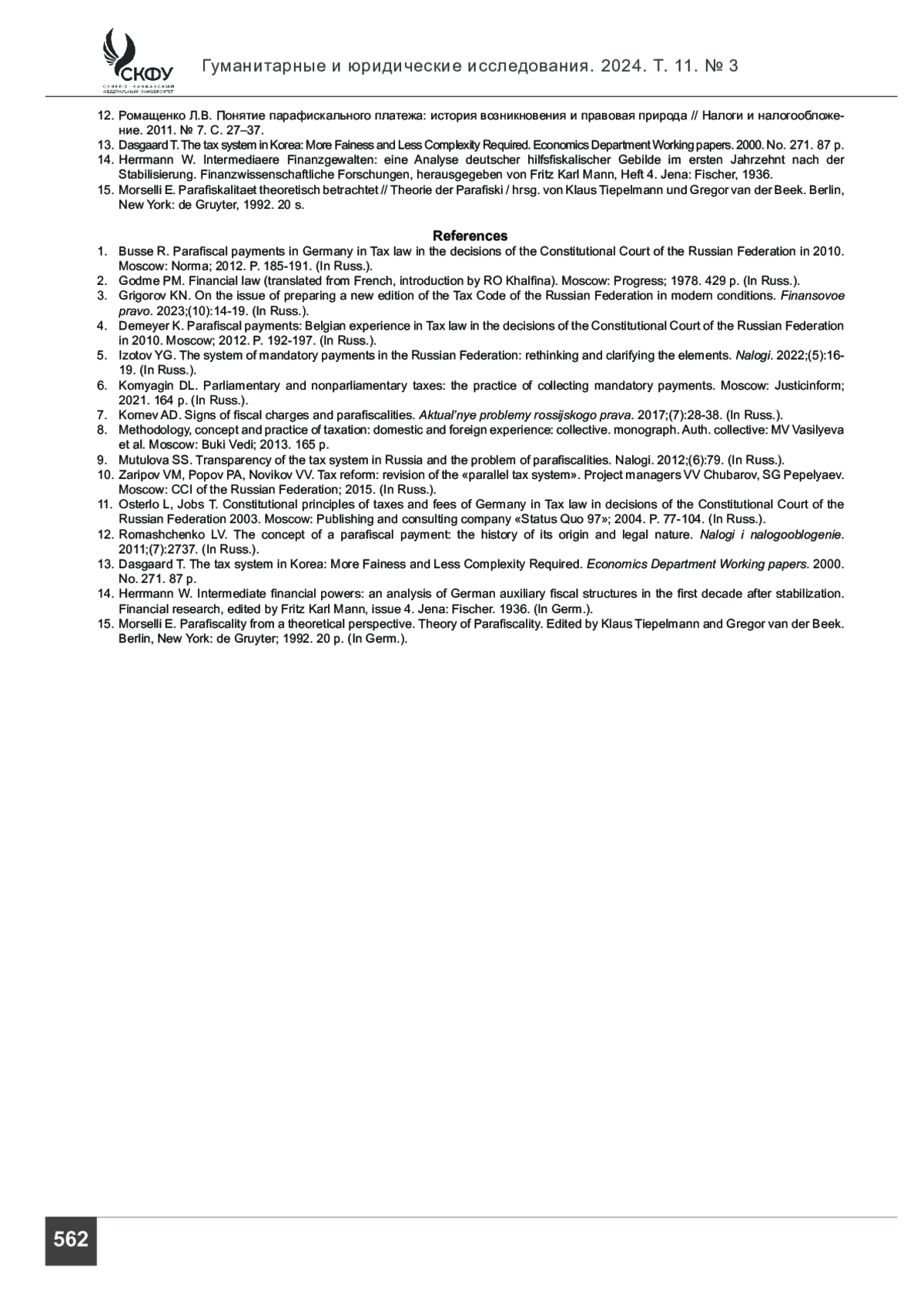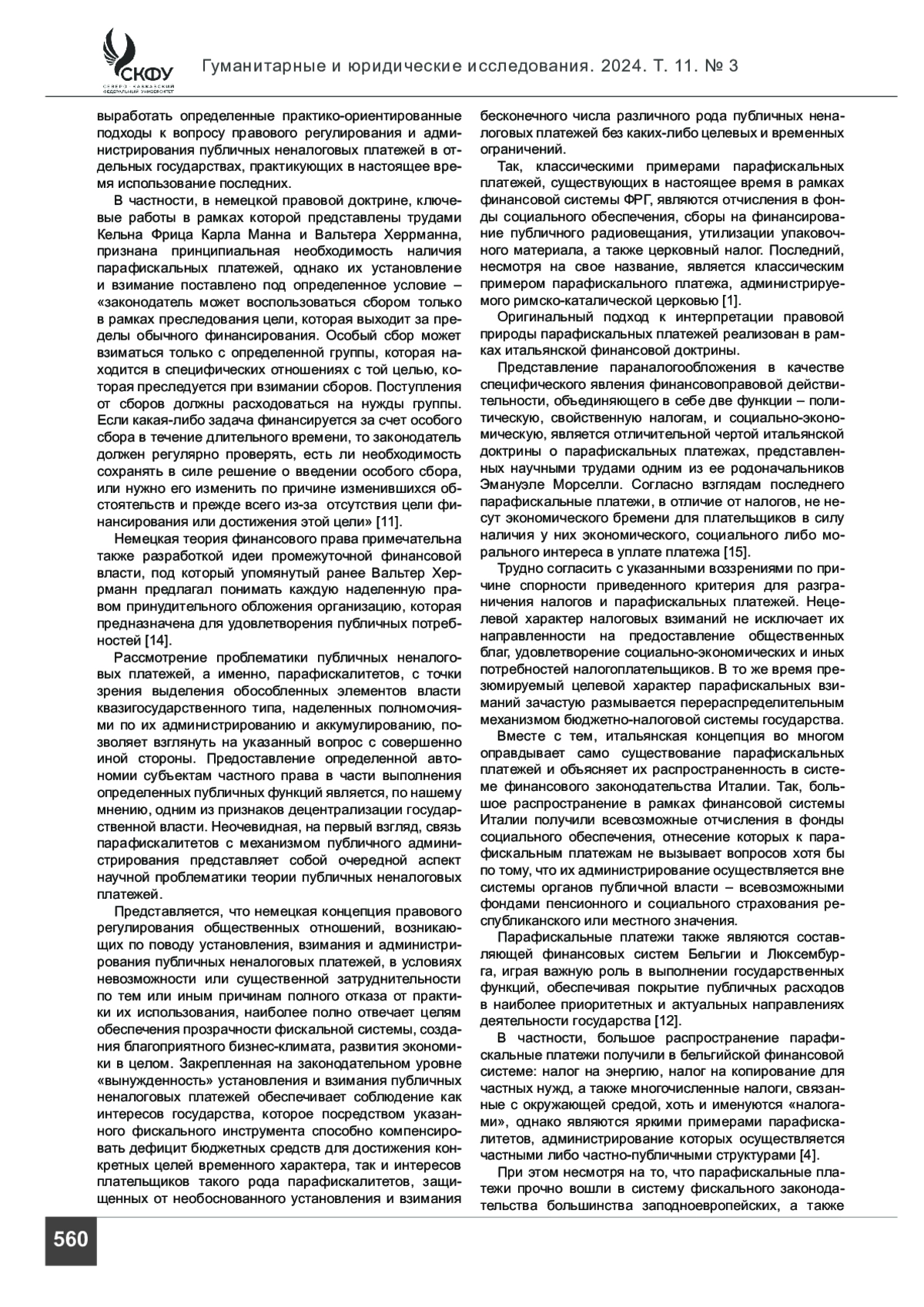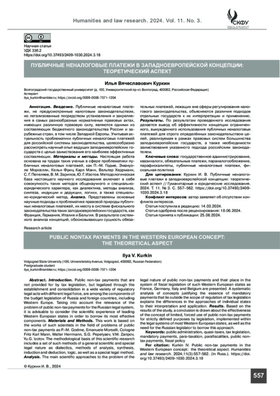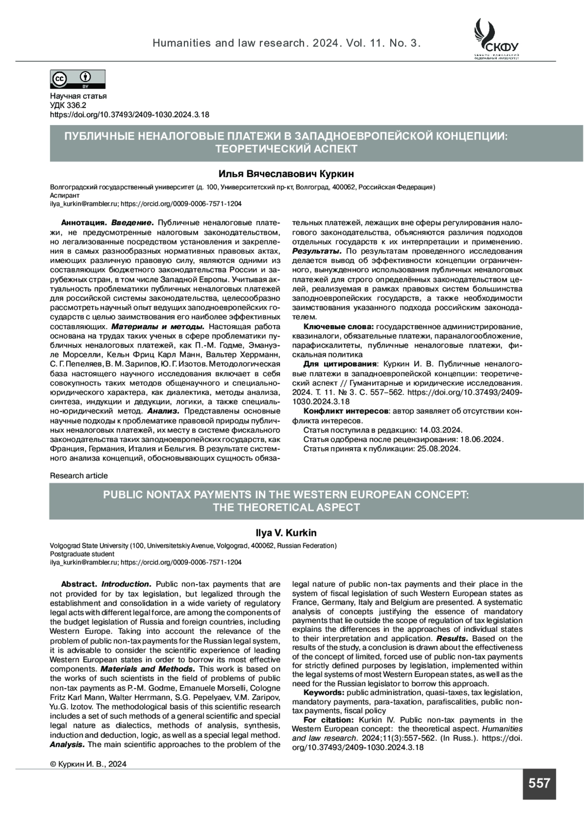 КУРКИН И. В. ПУБЛИЧНЫЕ НЕНАЛОГОВЫЕ ПЛАТЕЖИ В ЗАПАДНОЕВРОПЕЙСКОЙ КОНЦЕПЦИИ: ТЕОРЕТИЧЕСКИЙ АСПЕКТ // ГУМАНИТАРНЫЕ И ЮРИДИЧЕСКИЕ ИССЛЕДОВАНИЯ. 2024. ТОМ 11, № 3