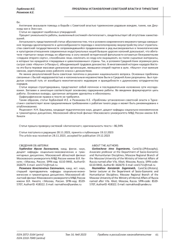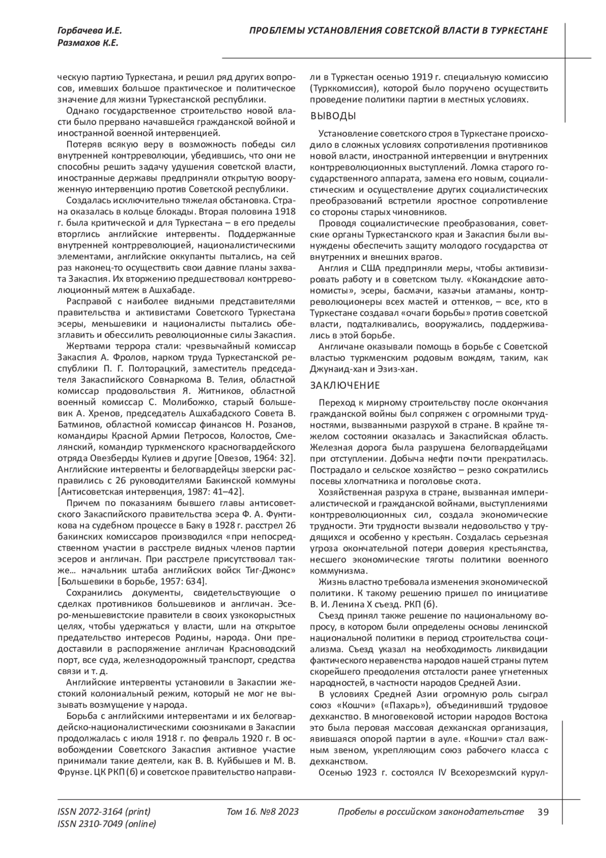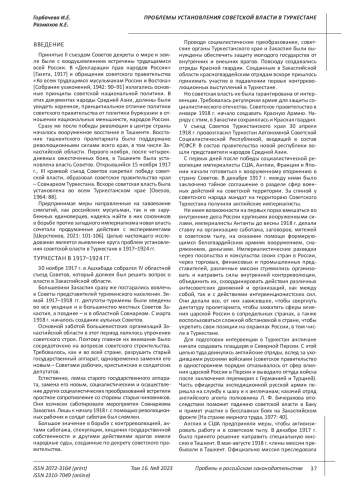 Целью статьи является исследование процесса установления советской власти в Туркестане в 1917-1924 гг. Авторы показывают, что установление советского строя в Туркестане происходило в сложных условиях сопротивления противников новой власти, иностранной интервенции и внутренних контрреволюционных выступлений. Наряду с созданием регулярной армии для защиты молодой государственности предпринимались меры социально-политического, экономического и идеологического характера.