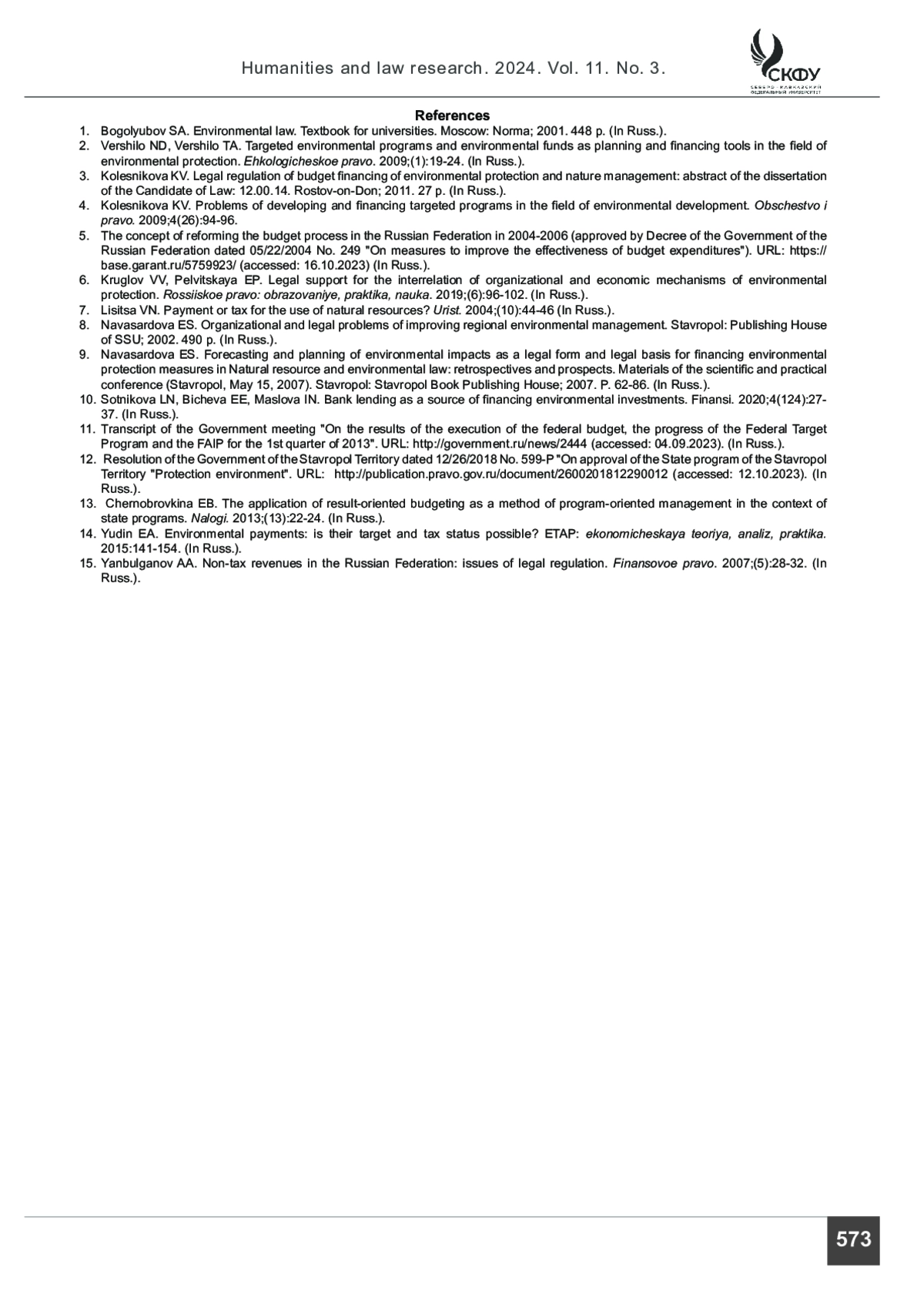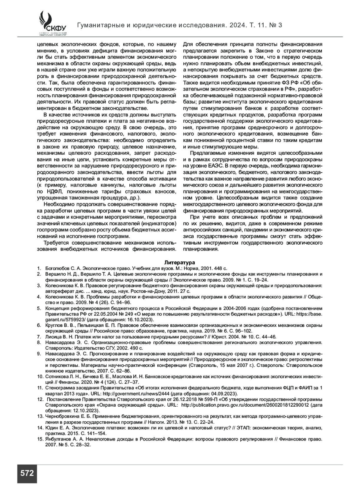 3. Колесникова К. В. Правовое регулирование бюджетного финансирования охраны окружающей среды и природопользования: автореферат дис. ... канд. юрид. наук. Ростов-на-Дону, 2011. 27 с.