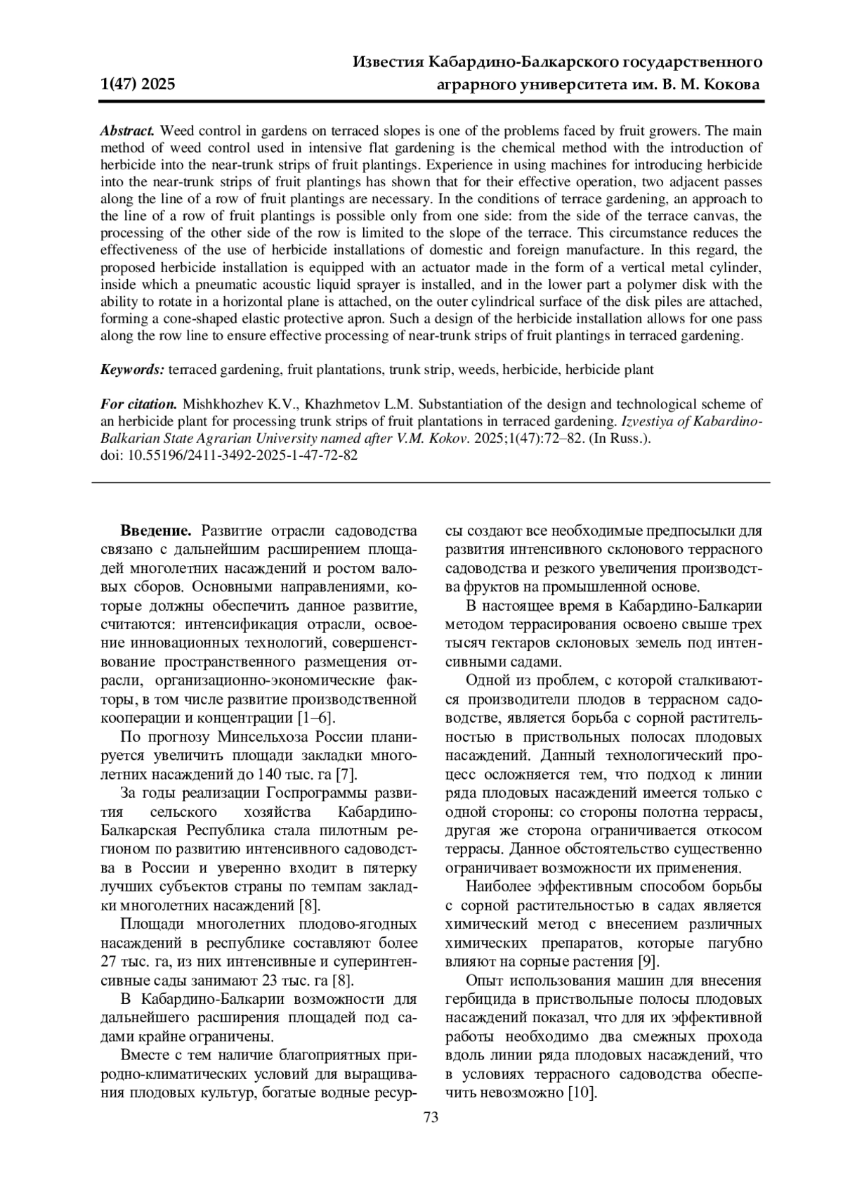 12. Мишхожев К. В., Хажметов Л. М., Хажметов К. Л. Тенденция развития установок для внесения гербицида в приствольные полосы плодовых насаждений в террасном садоводстве // Актуальные проблемы аграрной науки: прикладные и исследовательские аспекты: сб. науч. тр. III Всероссийской (национальной) научно-практической конференции. Нальчик: Кабардино-Балкарский ГАУ, 2023. С. 141-146. EDN: LPRZWX