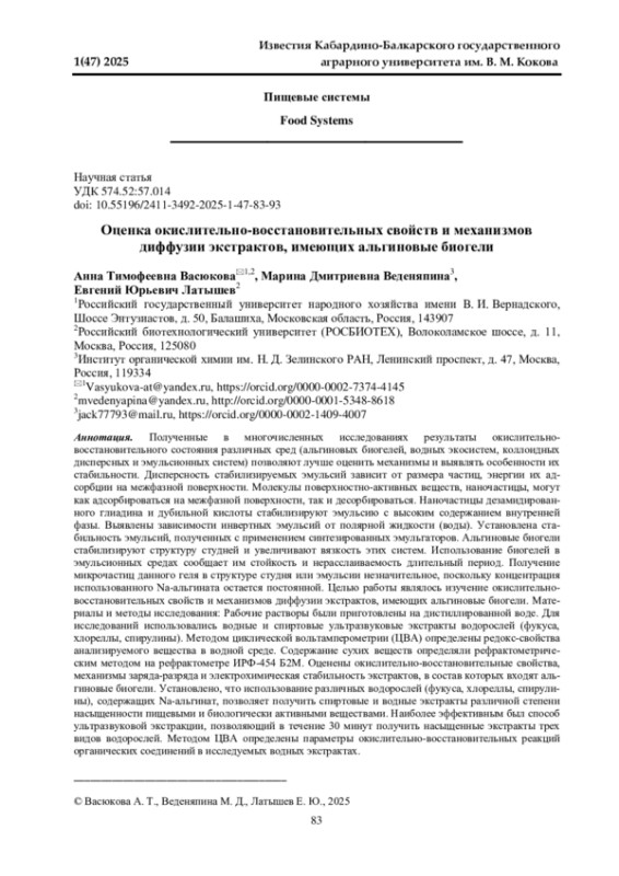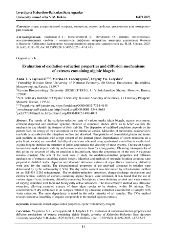 Полученные в многочисленных исследованиях результаты окислительно-восстановительного состояния различных сред (альгиновых биогелей, водных экосистем, коллоидных дисперсных и эмульсионных систем) позволяют лучше оценить механизмы и выявлять особенности их стабильности. Дисперсность стабилизируемых эмульсий зависит от размера частиц, энергии их адсорбции на межфазной поверхности. Молекулы поверхностно-активных веществ, наночастицы, могут как адсорбироваться на межфазной поверхности, так и десорбироваться. Наночастицы дезамидированного глиадина и дубильной кислоты стабилизируют эмульсию с высоким содержанием внутренней фазы. Выявлены зависимости инвертных эмульсий от полярной жидкости (воды). Установлена стабильность эмульсий, полученных с применением синтезированных эмульгаторов. Альгиновые биогели стабилизируют структуру студней и увеличивают вязкость этих систем. Использование биогелей в эмульсионных средах сообщает им стойкость и нерасслаиваемость длительный период. Получение микрочастиц данного геля в структуре студня или эмульсии незначительное, поскольку концентрация использованного Na-альгината остается постоянной. Целью работы являлось изучение окислительно-восстановительных свойств и механизмов диффузии экстрактов, имеющих альгиновые биогели. Материалы и методы исследования: Рабочие растворы были приготовлены на дистиллированной воде. Для исследований использовались водные и спиртовые ультразвуковые экстракты водорослей (фукуса, хлореллы, спирулины). Методом циклической вольтамперометрии (ЦВА) определены редокссвойства анализируемого вещества в водной среде. Содержание сухих веществ определяли рефрактометрическим методом на рефрактометре ИРФ-454 Б2М. Оценены окислительно-восстановительные свойства, механизмы заряда-разряда и электрохимическая стабильность экстрактов, в состав которых входят альгиновые биогели. Установлено, что использование различных водорослей (фукуса, хлореллы, спирулины), содержащих Na-альгинат, позволяет получить спиртовые и водные экстракты различной степени насыщенности пищевыми и биологически активными веществами. Наиболее эффективным был способ ультразвуковой экстракции, позволяющий в течение 30 минут получить насыщенные экстракты трех видов водорослей. Методом ЦВА определены параметры окислительно-восстановительных реакций органических соединений в исследуемых водных экстрактах.