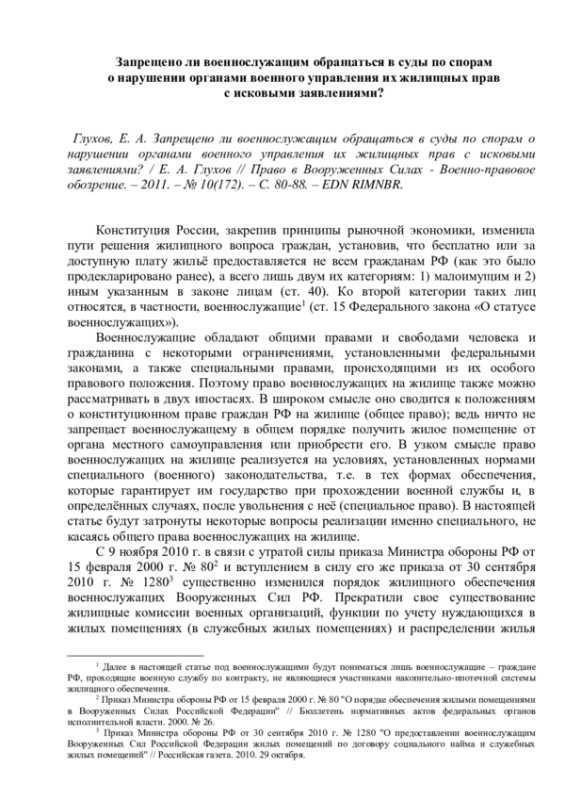 Глухов, Е. А. Запрещено ли военнослужащим обращаться в суды по спорам о нарушении органами военного управления их жилищных прав с исковыми заявлениями? / Е. А. Глухов // Право в Вооруженных Силах - Военно-правовое обозрение. – 2011. – № 10(172). – С. 80-88. – EDN RIMNBR.