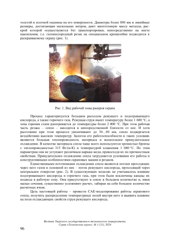 Газокислородный раскрой крупногабаритных отходов металлургической промышленности (т. е. скрапа) является актуальной и непростой (с технической точки зрения) задачей. Этот процесс осложняется большими габаритами скрапа и наличием Вестник Тверского государственного технического университета. Серия «Технические науки». No 1 (21), 2024 96 толстой и плотной окалины на его поверхности. Диаметры более 800 мм и линейные размеры, достигающие нескольких метров, дают многотонную массу металла, раскрой которой осуществляется без транспортировки, непосредственно на месте накопления, т. е. газокислородный резак на специальном кронштейне подводится к раскраиваемому скрапу (рис. 1)