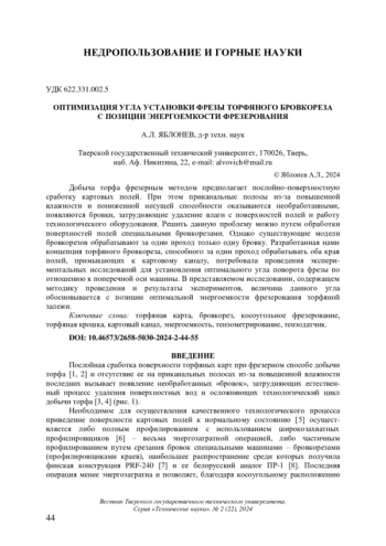 Добыча торфа фрезерным методом предполагает послойно-поверхностную сработку картовых полей. При этом приканальные полосы из-за повышенной влажности и пониженной несущей способности оказываются необработанными, появляются бровки, затрудняющие удаление влаги с поверхностей полей и работу технологического оборудования. Решить данную проблему можно путем обработки поверхностей полей специальными бровкорезами. Однако существующие модели бровкорезов обрабатывают за один проход только одну бровку. Разработанная нами концепция торфяного бровкореза, способного за один проход обрабатывать оба края полей, примыкающих к картовому каналу, потребовала проведения экспериментальных исследований для установления оптимального угла поворота фрезы по отношению к поперечной оси машины. В представляемом исследовании, содержащем методику проведения и результаты экспериментов, величина данного угла обосновывается с позиции оптимальной энергоемкости фрезерования торфяной залежи