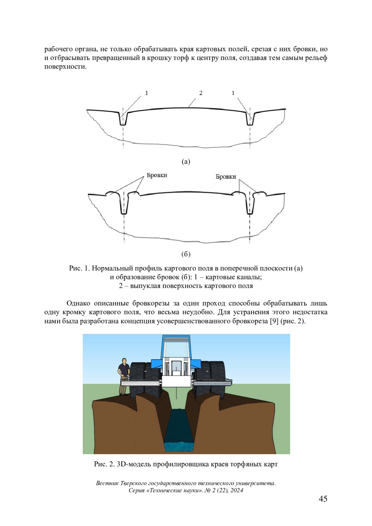 Послойная сработка поверхности торфяных карт при фрезерном способе добычи торфа [1, 2] и отсутствие ее на приканальных полосах из-за повышенной влажности последних вызывает появление необработанных «бровок», затрудняющих естественный процесс удаления поверхностных вод и осложняющих технологический цикл добычи торфа [3, 4] (рис. 1).