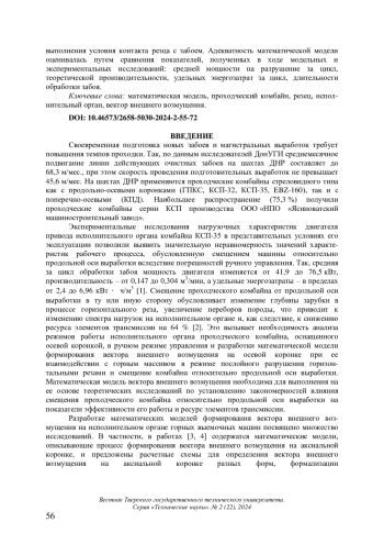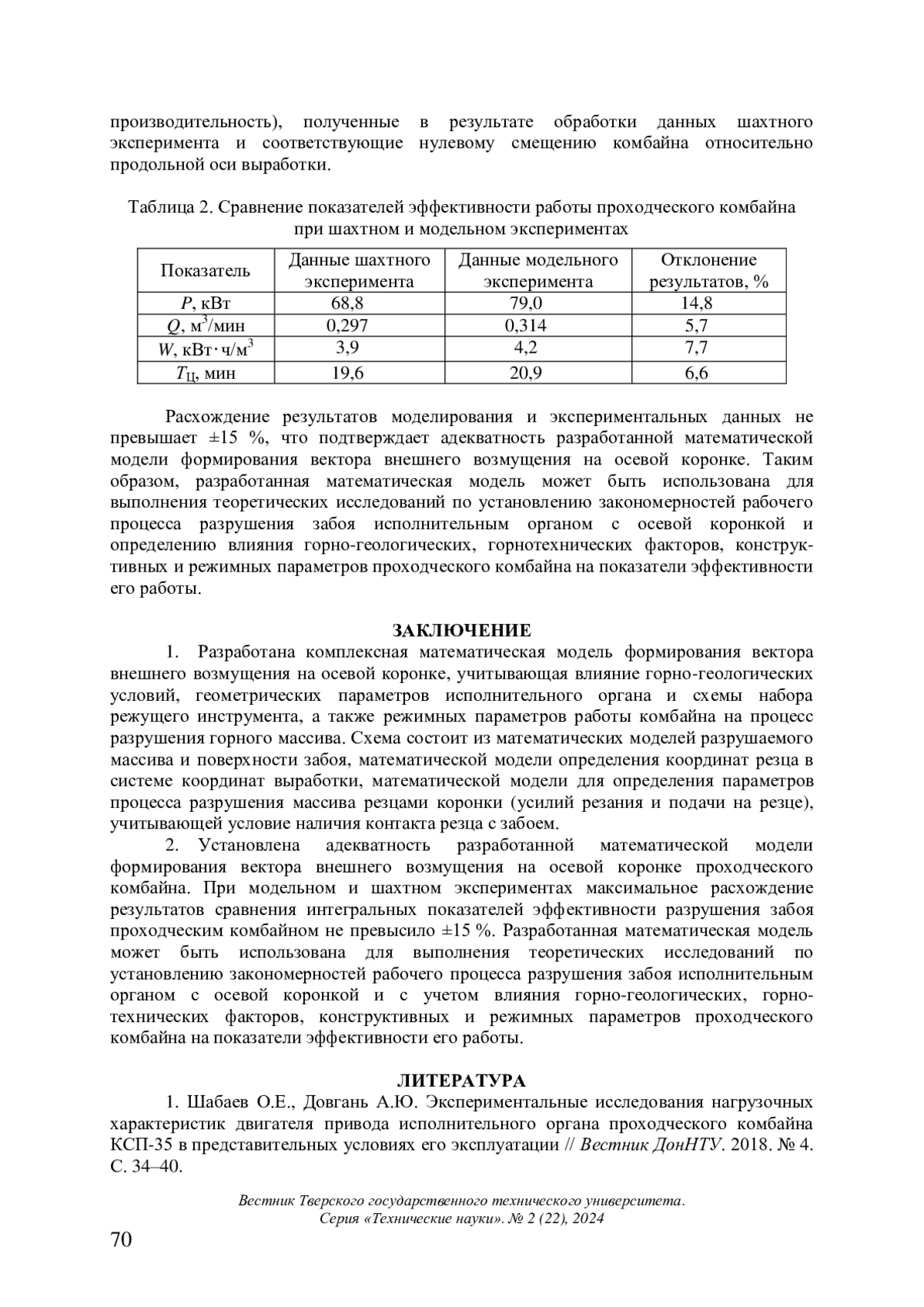 Разработана комплексная модель формирования вектора внешнего возмущения на осевой коронке исполнительного органа, учитывающая влияние горно-геологических условий и режимных параметров работы комбайна на процесс разрушения горного массива, которая состоит из моделей разрушаемого массива и поверхности забоя, нахождения координат вершины резца в забое, оценки условия контактирования резца с массивом, определения параметров процесса разрушения массива резцами коронки для определения усилий резания и подачи на резце с учетом выполнения условия контакта резца с забоем. Адекватность математической модели оценивалась путем сравнения показателей, полученных в ходе модельных и экспериментальных исследований: средней мощности на разрушение за цикл, теоретической производительности, удельных энергозатрат за цикл, длительности обработки забоя