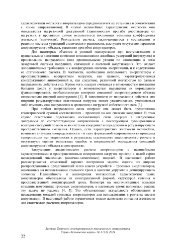 Традиционно статический расчет систем амортизации выполняется на начальном этапе их разработки и предназначен для обеспечения рационального выбора количества и способа размещения амортизаторов в составе системы [1, 2]. Исходные данные для расчета включают в себя величины и направления действия сил инерции, характеристики жесткости амортизаторов (предполагается их установка в соответствии с этими направлениями). В случае нелинейных характеристик жесткости они описываются нагрузочной диаграммой (зависимостью прогиба амортизатора от нагрузки), в противном случае используется постоянная величина коэффициента жесткости (упругости). Результатом расчета, заключающегося в составлении и решении системы уравнений статического равновесия, выступает отсутствие перекосов амортизируемого объекта, равенство прогибов амортизаторов
