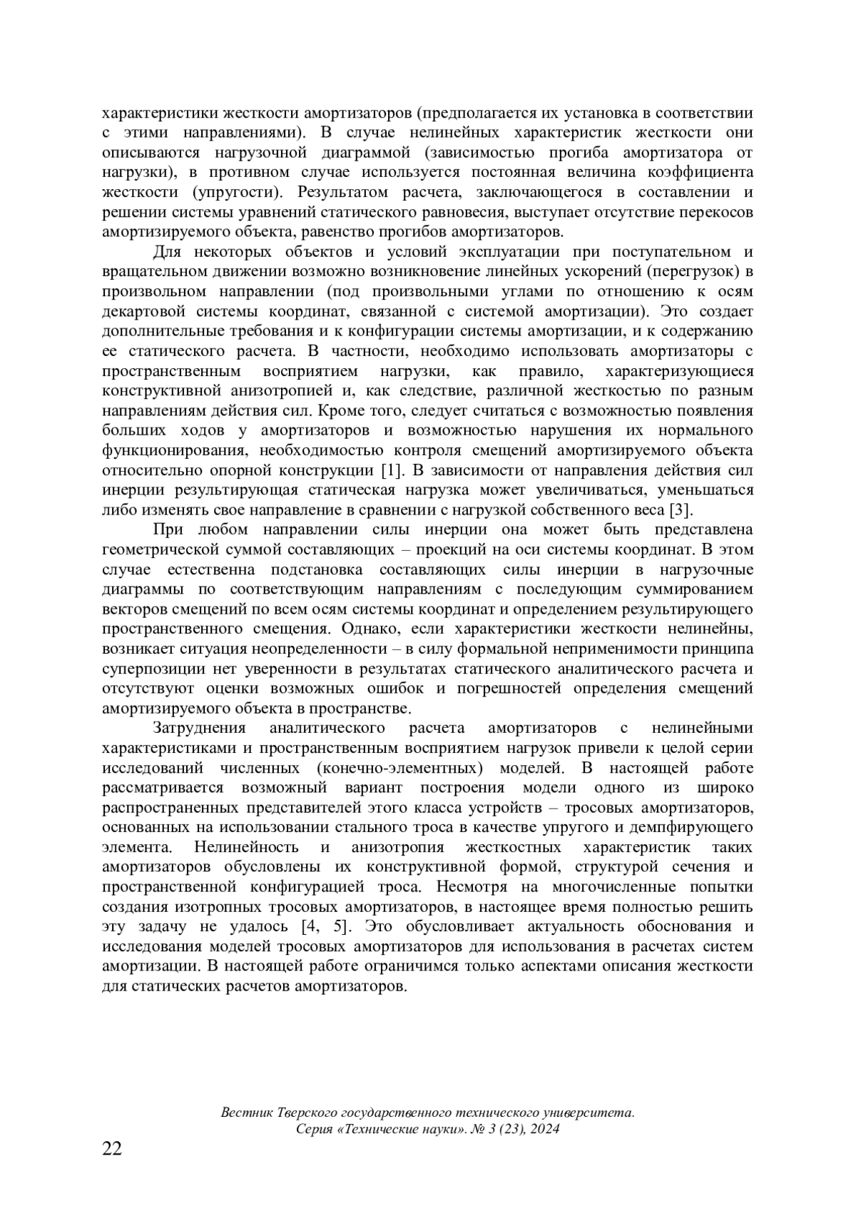 Отмечены затруднения, возникающие при аналитическом расчете амортизаторов с нелинейными характеристиками и пространственным восприятием нагрузок. Рассмотрены трудности численного моделирования троса для анализа механического поведения амортизаторов, связанные со структурной сложностью и размерностью задачи. Разработан технически обоснованный подход к построению линеаризованной численной модели тросового амортизатора, базирующийся на экспериментальных оценках жесткости. Данный подход позволяет снизить размерность и требования к вычислительным ресурсам за счет упрощения структуры троса. Подчеркнуто, что адекватность и возможность использования полученной численной модели тросового амортизатора для предварительных упрощенных расчетов систем амортизации с последующей экспериментальной отработкой и уточнением результатов опираются на анализ погрешности численной модели