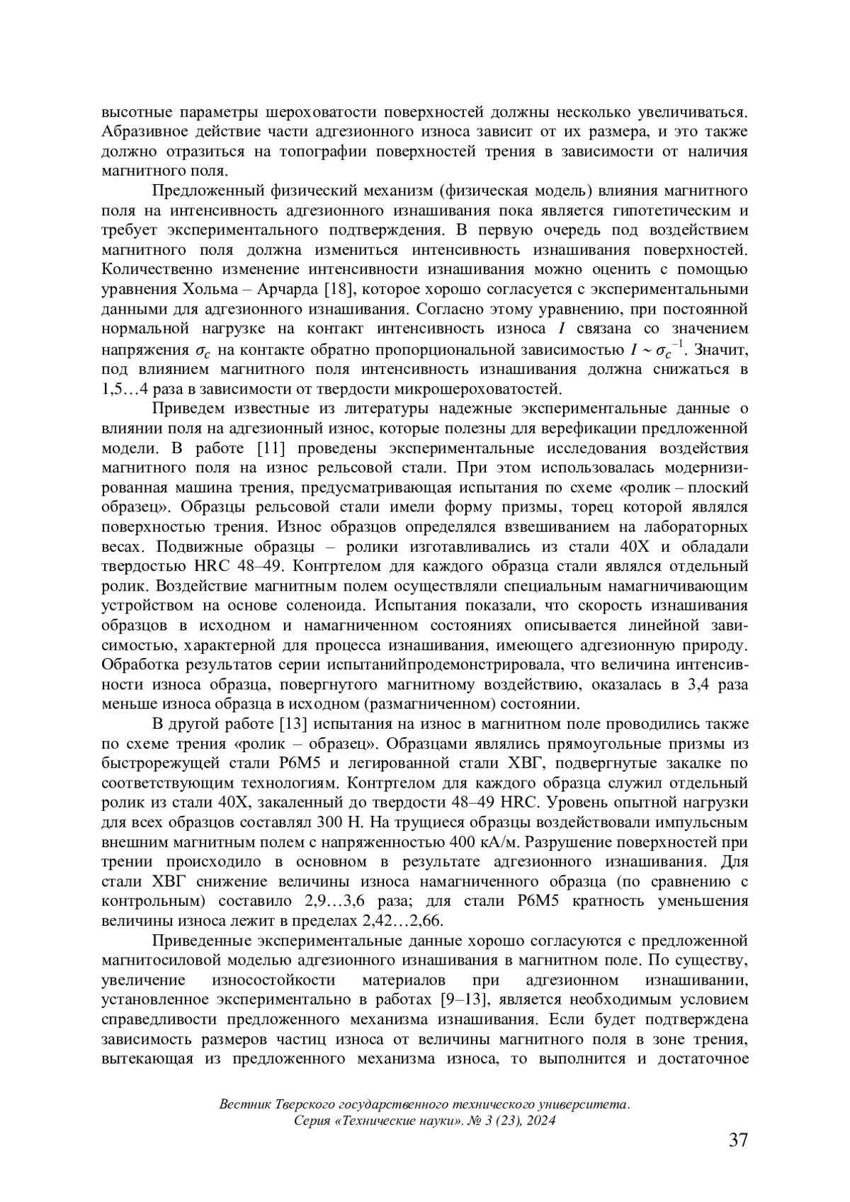 В работе приведена новая модель адгезионного изнашивания поверхностей при наложении магнитного поля. Предложено учитывать магнитостатические силы, действующие в процессе отделения частиц износа. Подчеркнуто, что на качественном уровне модель хорошо согласуется с экспериментальными результатами. Отмечено, что полученные результаты могут быть использованы для прогнозирования свойств трибоузлов, работающих в магнитных полях.