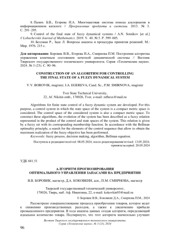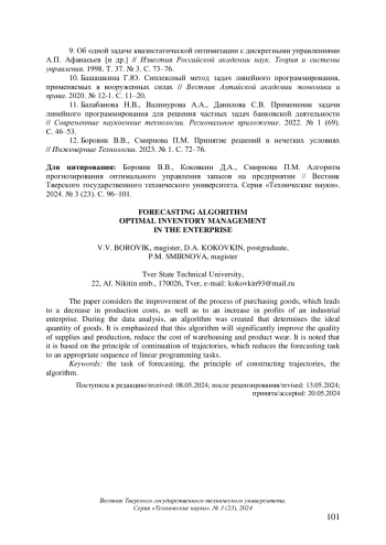 БОРОВИК В. В., КОКОВКИН Д. А., СМИРНОВА П. М. АЛГОРИТМ ПРОГНОЗИРОВАНИЯ ОПТИМАЛЬНОГО УПРАВЛЕНИЯ ЗАПАСАМИ НА ПРЕДПРИЯТИИ // ВЕСТНИК ТВЕРСКОГО ГОСУДАРСТВЕННОГО ТЕХНИЧЕСКОГО УНИВЕРСИТЕТА. СЕРИЯ: ТЕХНИЧЕСКИЕ НАУКИ. 2024. № 3 (23)
