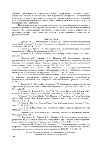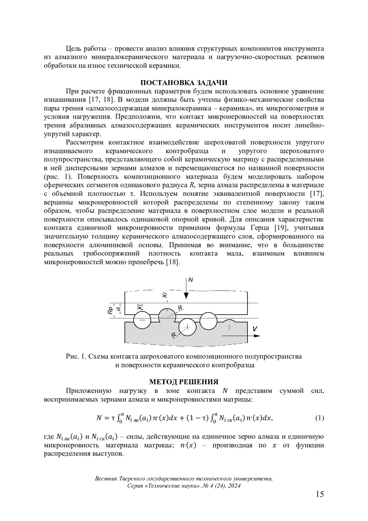 Ключевые фразы: абразивный алмазный инструмент, алмазная минералокерамика, обработка керамики, модель контактного взаимодействия, производительность шлифования, износ алмазного инструмента