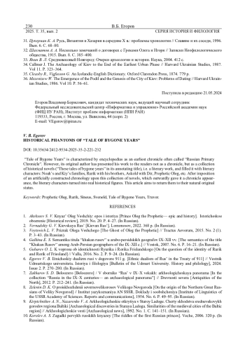 1. Алексеев С. В. Князь Олег Вещий: эпос и история // Историческое обозрение, 2019. № 20. С. 4-27. EDN: YXTWJV
