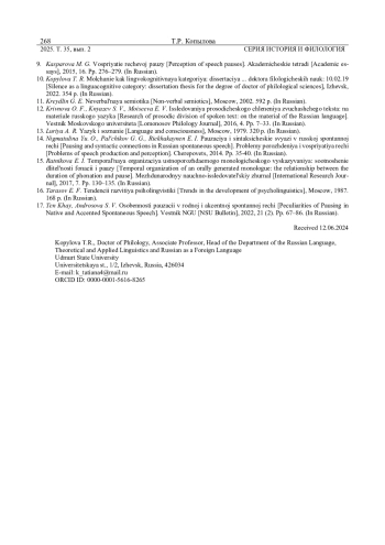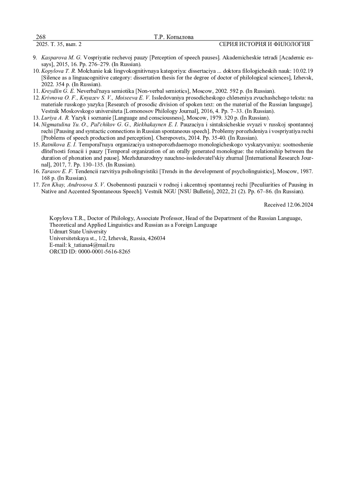 15. Ратникова Е. И. Темпоральная организация устнопорождаемого монологического высказывания: соотношение длительности фонации и паузы // Международный научно-исследовательский журнал. 2017. № 7. С. 130-135. EDN: ZBHXPN