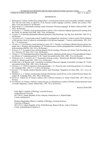 1. Бехнамади Л. Полные и краткие формы прилагательные в современном русском языке (семантика, стилистика и синтаксис) // URL: https://www.inst.at/trans/25.