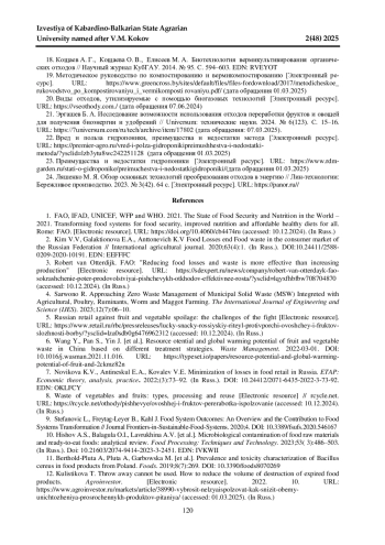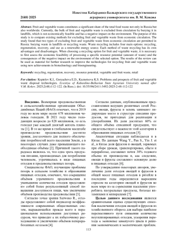 КОПТЕЛОВ К. И., ГОРЯЧЕВА Е. Д., КУЗНЕЦОВА К. С. ПРОБЛЕМЫ И ПЕРСПЕКТИВЫ ТЕХНОЛОГИЙ УТИЛИЗАЦИИ ОТХОДОВ ОВОЩЕЙ И ФРУКТОВ // ИЗВЕСТИЯ КАБАРДИНО-БАЛКАРСКОГО ГОСУДАРСТВЕННОГО АГРАРНОГО УНИВЕРСИТЕТА ИМ. В. М. КОКОВА. 2025. № 2 (48)