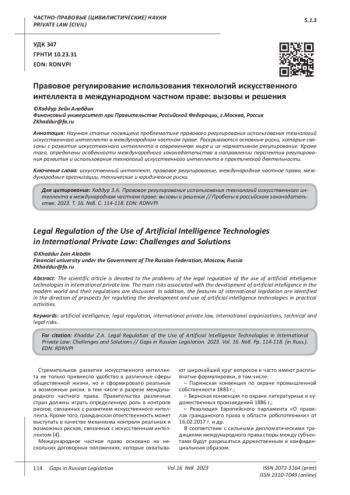 Golubtsova D.D. On some features of the legal regulation of intellectual property in private international law. The role of artificial intelligence and the problems of its use in the context of the protection of intellectual rights // Bulletin of Science. - 2023. - pp. 93-97.