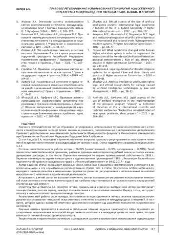 5. Журков А.А. Этические аспекты использования систем искусственного интеллекта: международно-правовой опыт / Вестник Университета имени О. Е. Кутафина // ВАК. - 2022. - C. 186-192.