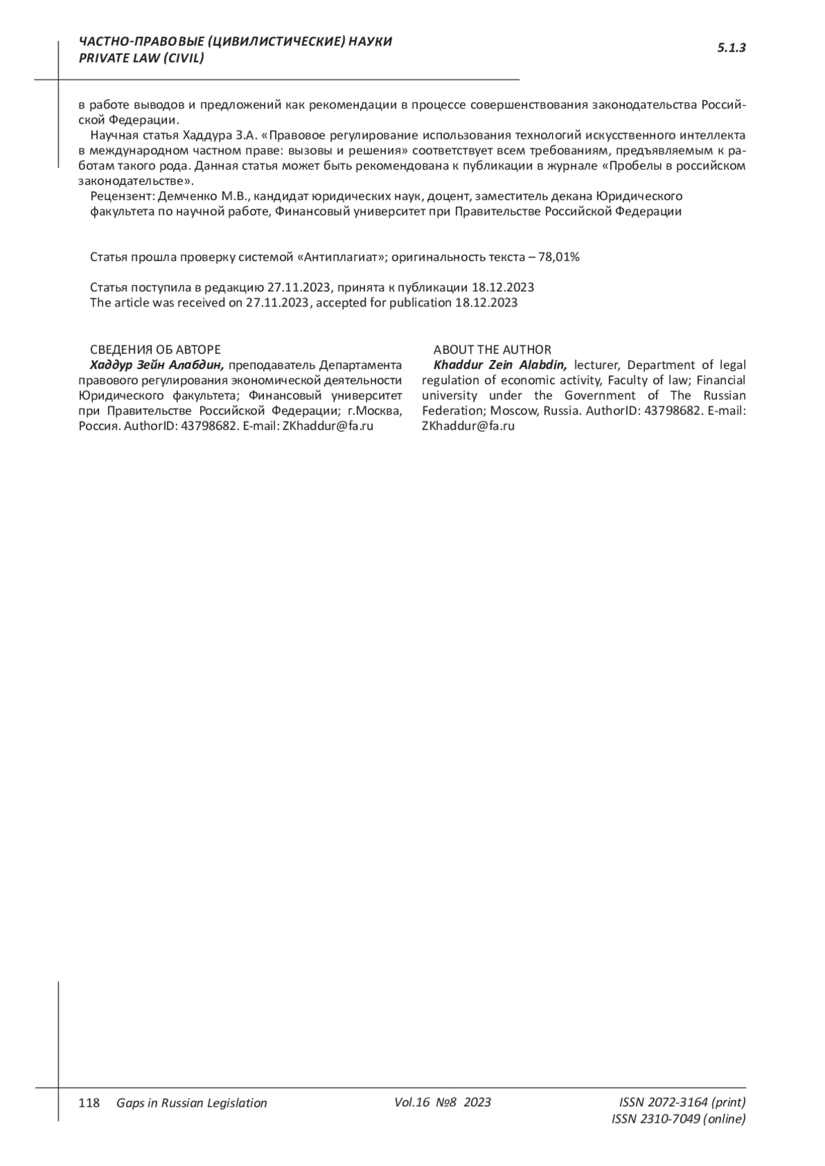 Khaddur Z.A. Artificial intelligence and human rights: legal and ethical responsibility for damage caused by artificial intelligence technologies // Law and Management. - 2023. - pp. 18-23.