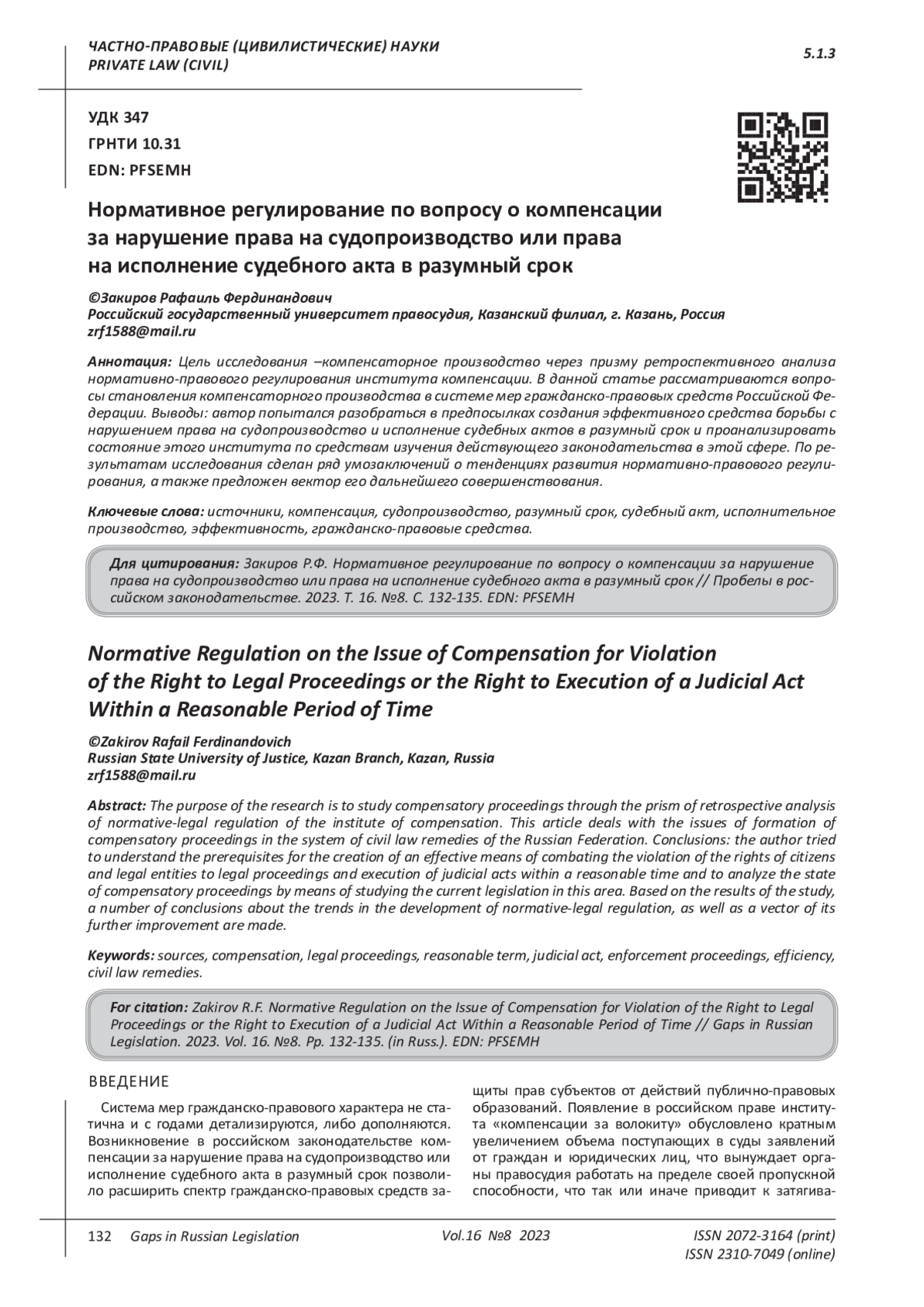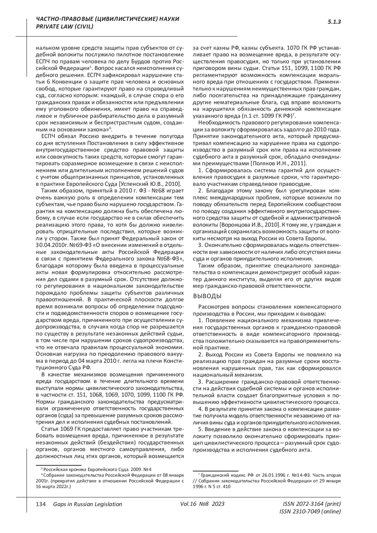2. Успенский Ю.В. Гражданско-правовые аспекты компенсации за нарушение права на судопроизводство или права на исполнение судебного акта в разумный срок: дис. … канд. юрид. наук. Москва, 2010. 184 с. EDN: QEYQJZ
