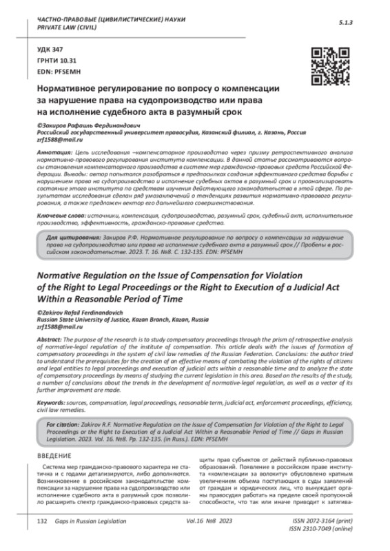 Simonov I.D. Proceedings on awarding compensation for violation of the right to legal proceedings within a reasonable time or the right to execute a judicial act within a reasonable time: dis. …can. jur., Saratov, 2015. p. 252. EDN: ZPRBHJ