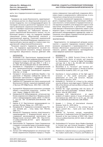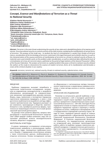 САБИТОВ Р. А., МАЙОРОВ А. В., ПАСС А. А., БЕГИШЕВ И. Р., ШУТОВА А. А., СКОРОБОГАТОВ А. В. ПОНЯТИЕ, СУЩНОСТЬ И ПРОЯВЛЕНИЯ ТЕРРОРИЗМА КАК УГРОЗЫ НАЦИОНАЛЬНОЙ БЕЗОПАСНОСТИ // ПРОБЕЛЫ В РОССИЙСКОМ ЗАКОНОДАТЕЛЬСТВЕ. 2023. Т. 16 № 8 (36 СТ.)
