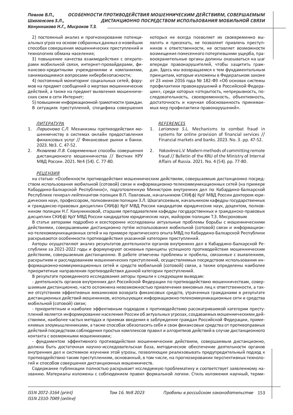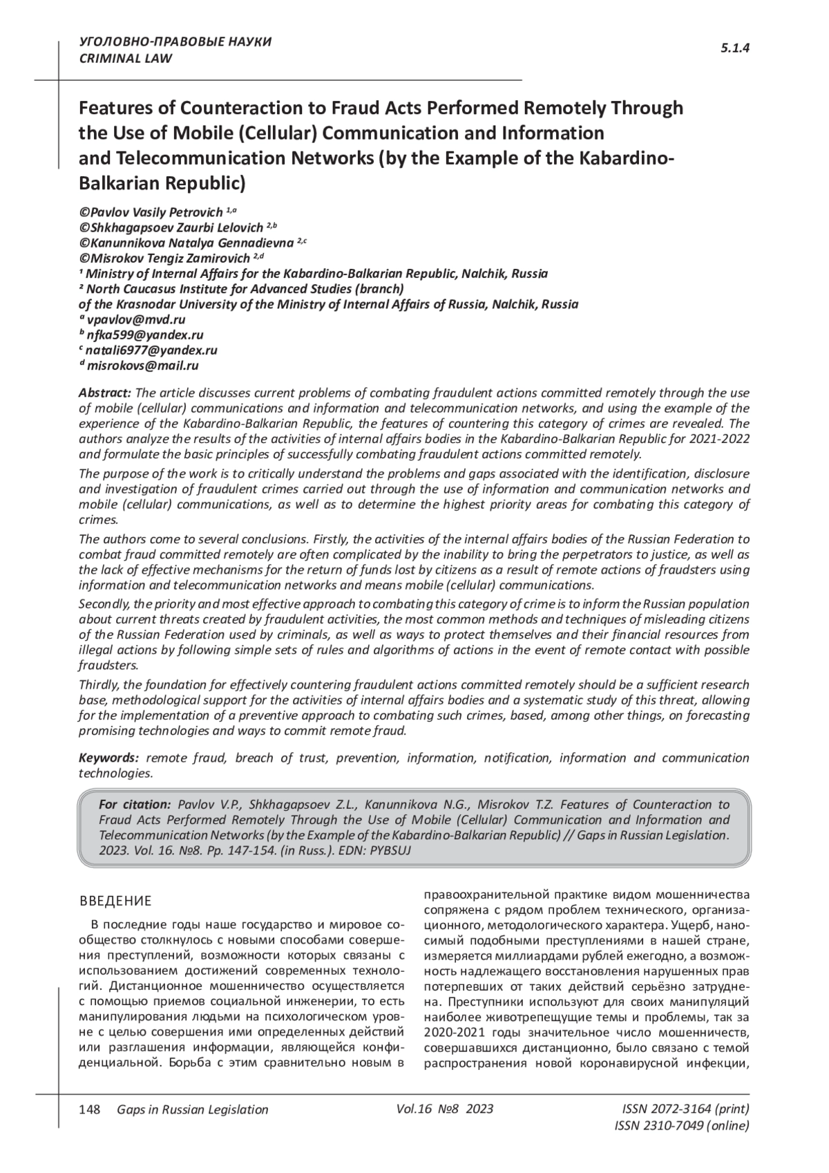 В статье рассматриваются актуальные проблемы борьбы с мошенническими действиями, совершаемыми дистанционно путём использования мобильной (сотовой) связи и информационно-телекоммуникационных сетей, и на примере опыта Кабардино-Балкарской Республики раскрываются особенности противодействия указанной категории преступлений. Авторы осуществляют анализ результатов деятельности органов внутренних дел в Кабардино-Балкарской Республике за 2021-2022 годы и формулируют основные принципы успешного противодействия мошенническим действиям, совершаемым дистанционно. Цель работы заключается в критическом осмыслении проблем и пробелов, связанных с выявлением, раскрытием и расследованием мошеннических преступлений, осуществляемых посредством использования информационно-коммуникационных сетей и средств мобильной (сотовой) связи, а также в определении наиболее приоритетных направлений противодействия данной категории преступлений. Авторы приходят к нескольким выводам. Во-первых, деятельность органов внутренних дел Российской Федерации по противодействию мошенничествам, совершаемым дистанционно, часто осложнена невозможностью привлечения виновных лиц к ответственности, а также отсутствием эффективных механизмов возврата финансовых средств, утраченных гражданами в результате дистанционных действий мошенников, использующих информационно-телекоммуникационные сети и средства мобильной (сотовой) связи. Во-вторых, приоритетным и наиболее эффективным подходом к противодействию рассматриваемой категории преступлений является информирование населения России об актуальных угрозах, создаваемых мошенническими действиями, наиболее частых методах и приемах введения в заблуждение граждан Российской Федерации, применяемых злоумышленниками, а также способах обезопасить себя и свои финансовые средства от противоправных действий посредством соблюдения простых комплексов правил и алгоритмов действий в случае дистанционного контакта с возможными мошенниками. В-третьих, фундаментом эффективного противодействия мошенническим действиям, совершаемым дистанционно, должна быть достаточная научно-исследовательская база, методическое обеспечение деятельности органов внутренних дел и системное изучение этой угрозы, позволяющие реализовывать предупредительный подход к противодействию таким преступлениям, основанный, в том числе, на прогнозировании перспективных технологий и способов совершения дистанционных мошенничеств.