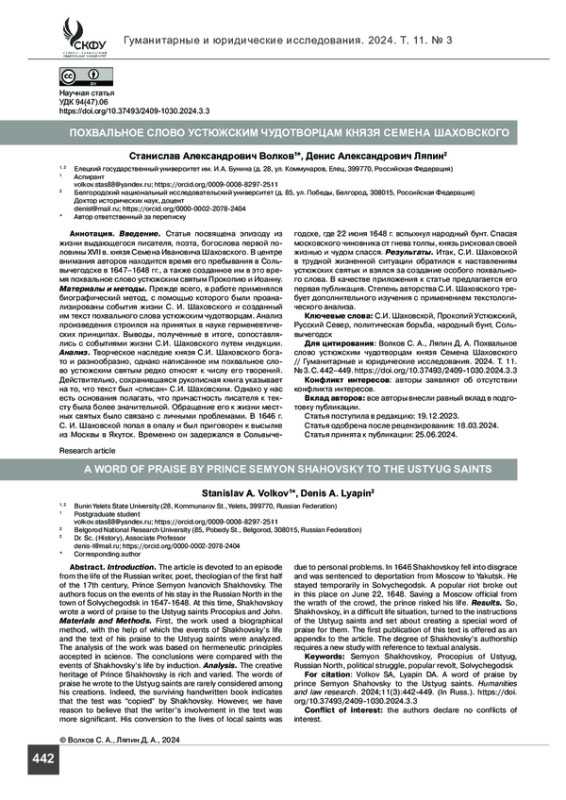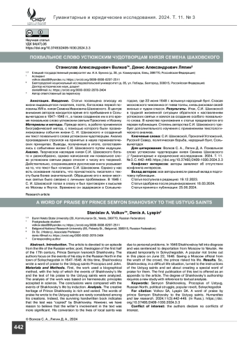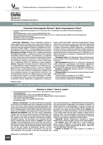 Введение. Статья посвящена эпизоду из жизни выдающегося писателя, поэта, богослова первой половины XVII в. князя Семена Ивановича Шаховского. В центре внимания авторов находится время его пребывания в Сольвычегодске в 1647–1648 гг., а также созданное им в это время похвальное слово устюжским святым Прокопию и Иоанну.