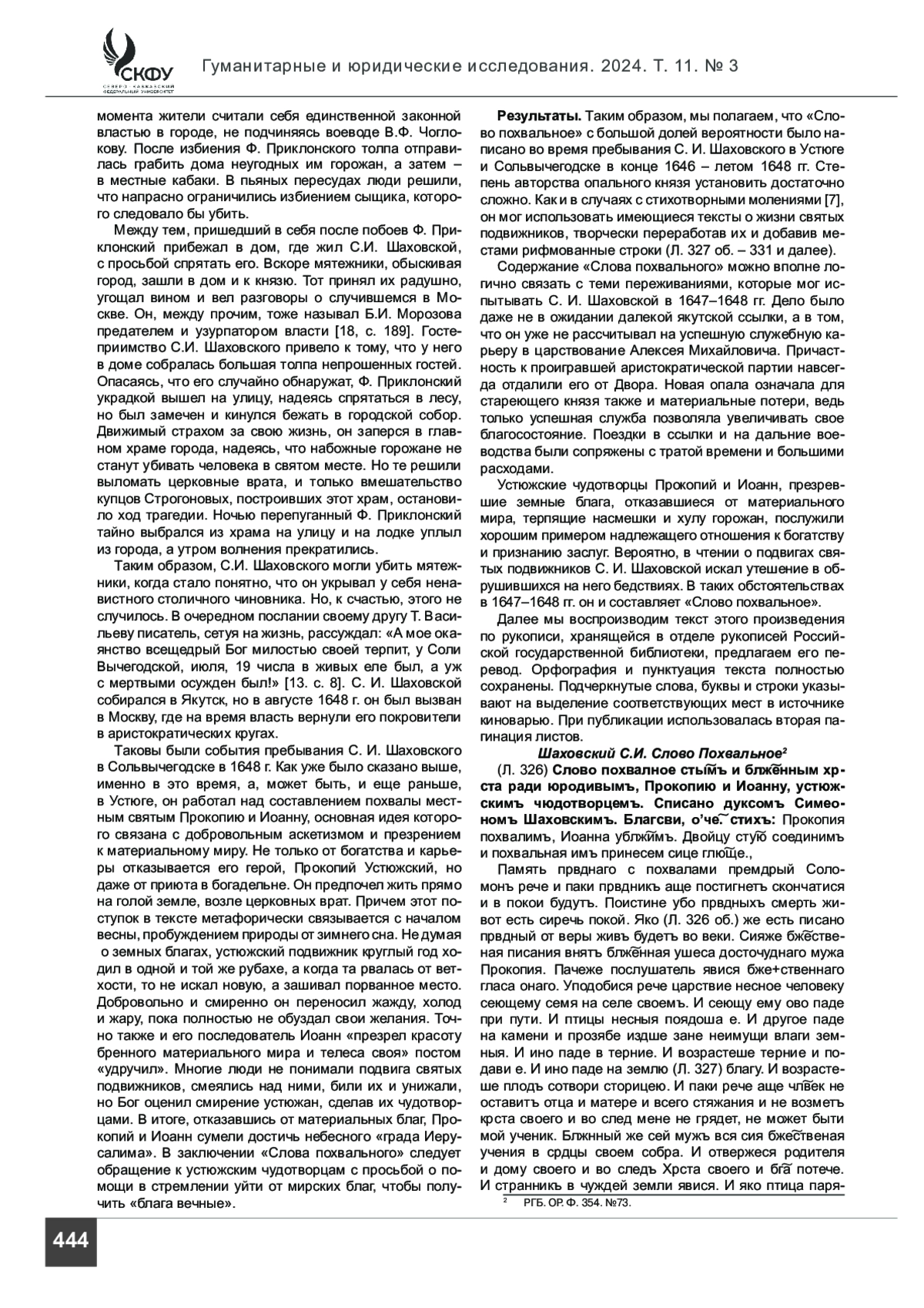 Результаты. Итак, С. И. Шаховской в трудной жизненной ситуации обратился к наставлениям устюжских святых и взялся за создание особого похвального слова. В качестве приложения к статье предлагается его первая публикация. Степень авторства С. И. Шаховского требует дополнительного изучения с применением текстологического анализа.